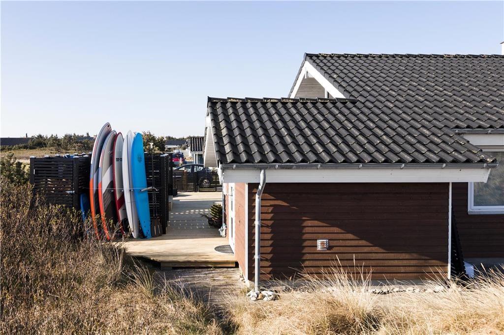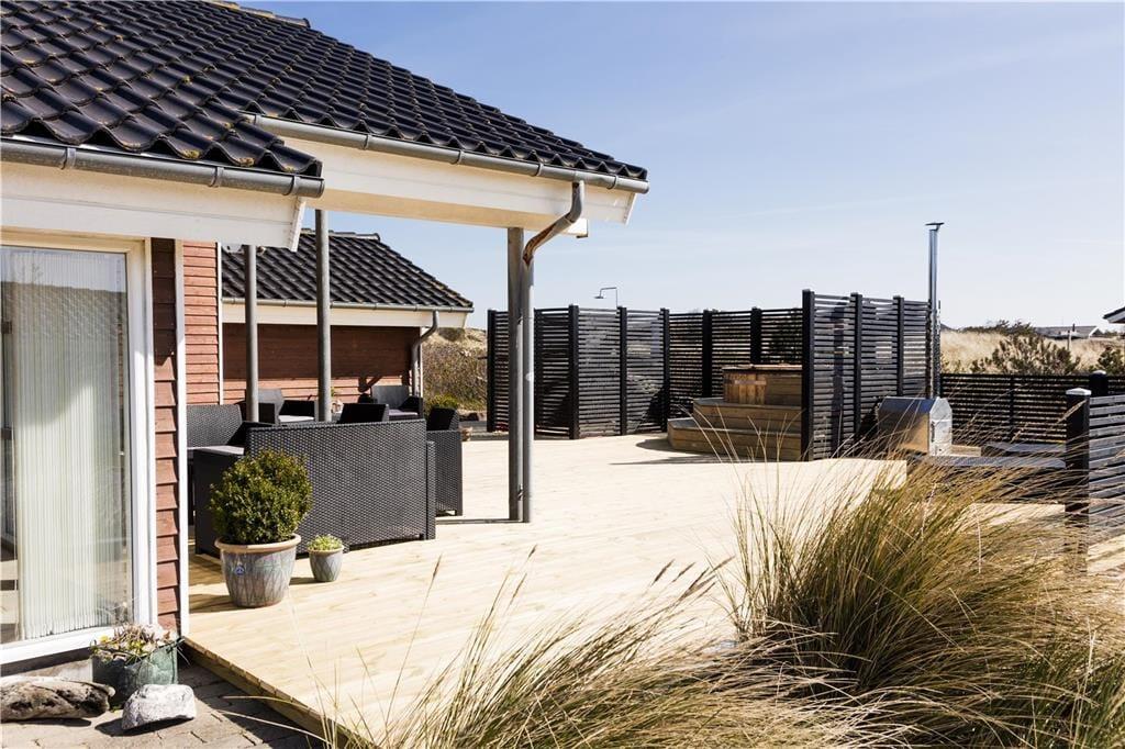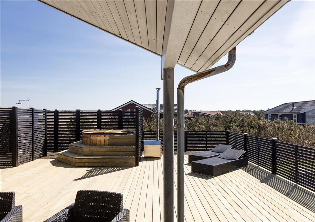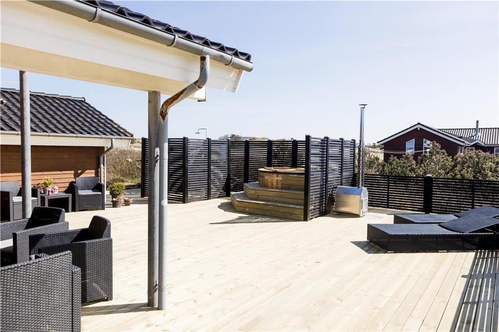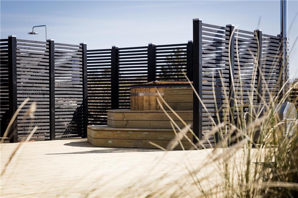 Sommerhusets beliggenhed og udearealer er noget helt særligt. Her er en stor træterrasse, hvor du kan starte dagen med morgenkaffe, mens du indånder den friske havluft. Efter en dag med eventyr i naturen kan du nyde en varm dukkert i det dejlige vildmarksbad, mens du kigger på stjernerne. Forfrisk dig efter en strandtur under den praktiske udebruser, der både tilbyder varmt og koldt vand – perfekt til både små sandfødder og voksne surfere. Den lukkede grund giver privatliv og ro, mens børnene har rig mulighed for at lege frit.