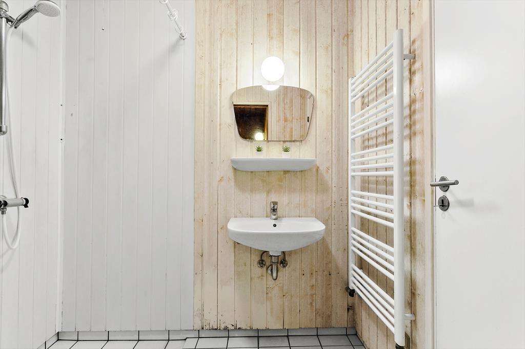 Fra køkkenet er der adgang til et sjovt poolrum, hvor både børn og voksne kan få nogle gode timer til at gå i det 17m2 store bassin eller i spabadet, hvis man mest af alt trænger til at slappe af og lade kroppen få lidt ny energi. Her har i ligeledes muligheden for at benytte et af husets helt store aktiver - den nye store sauna fra 2024. I forbindelse med poolrummet ligger sommerhusets ene badeværelse.