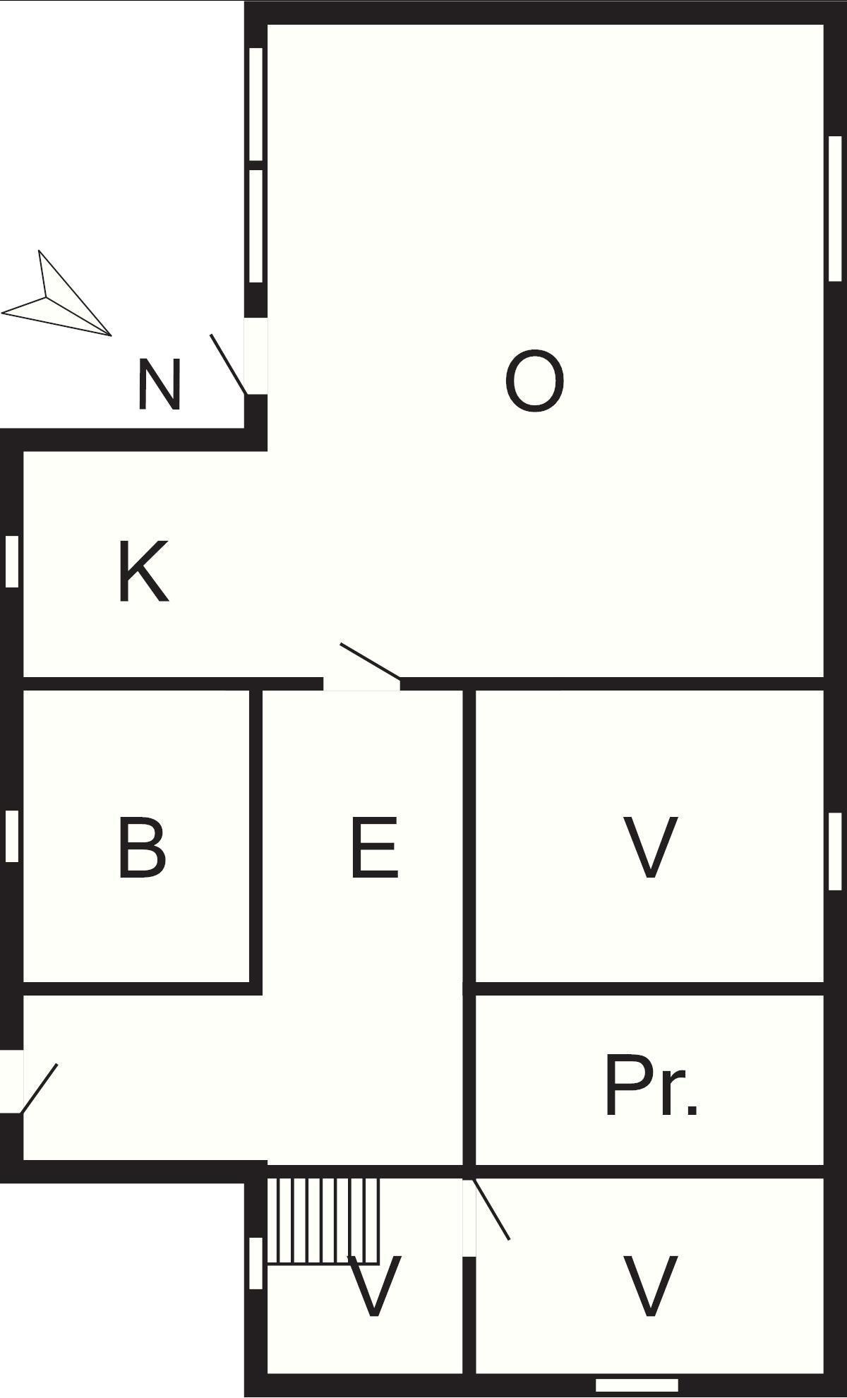 Indvendigt er der et mindre køkken i åben forbindelse med opholdsstue. Køkkenet har køle- og fryseskab samt elkomfur. Stuen har brændeovn, sofa og spiseplads.