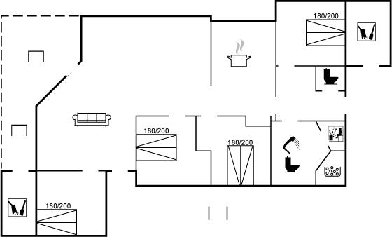 Der er i alt 4 soveværelser. Sovepladserne fordeler sig på: 6 sovepladser i dobbeltsenge. 2 sovepladser i enkeltsenge.