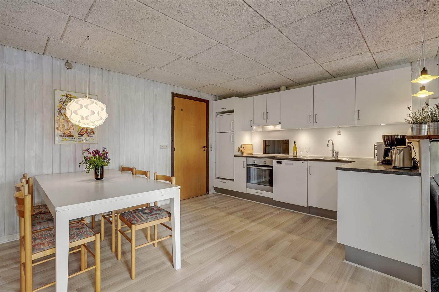 Køkkenet er udstyret med 1 køleskab. Der er 4 keramiske kogeplader, varmluftovn, mikrobølgeovn samt opvaskemaskine.