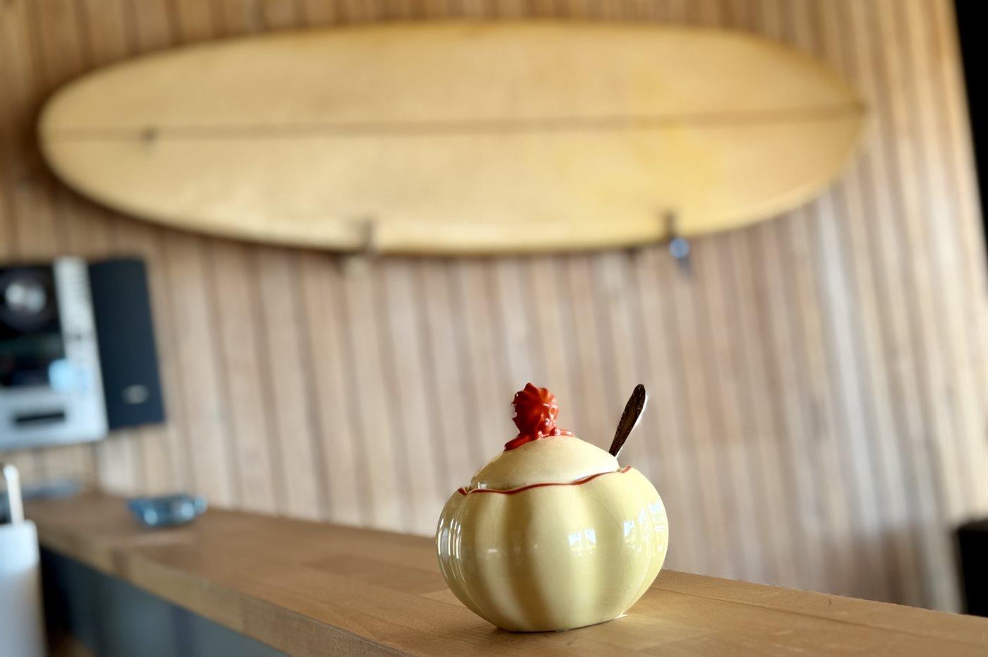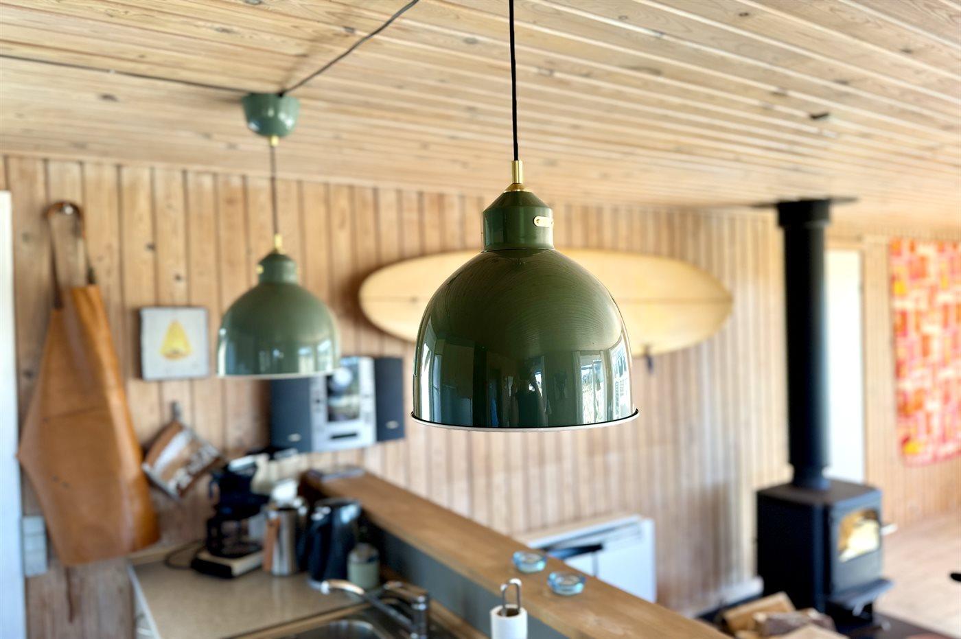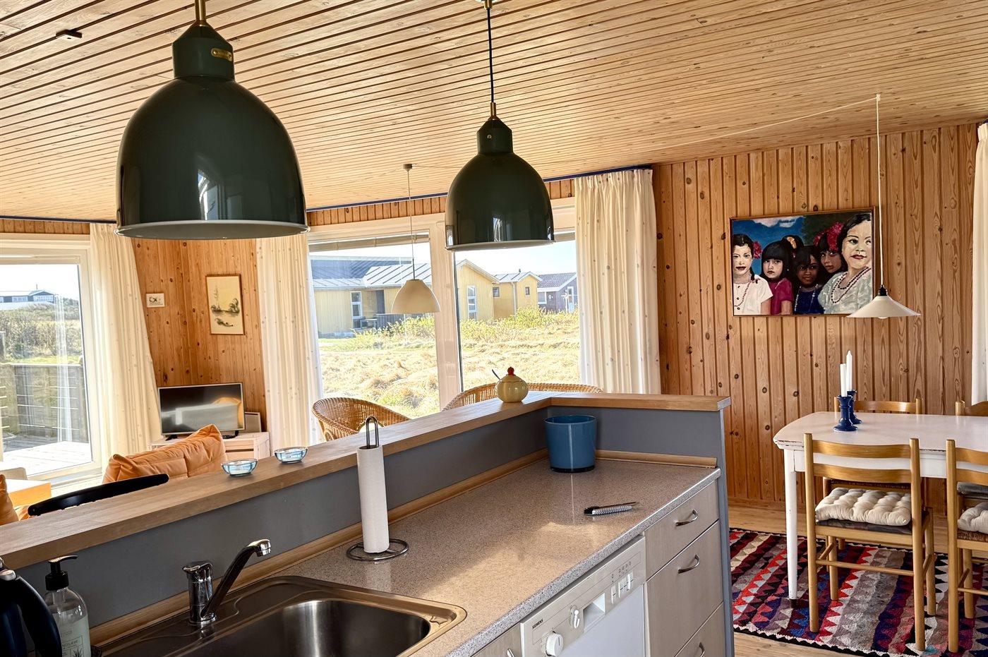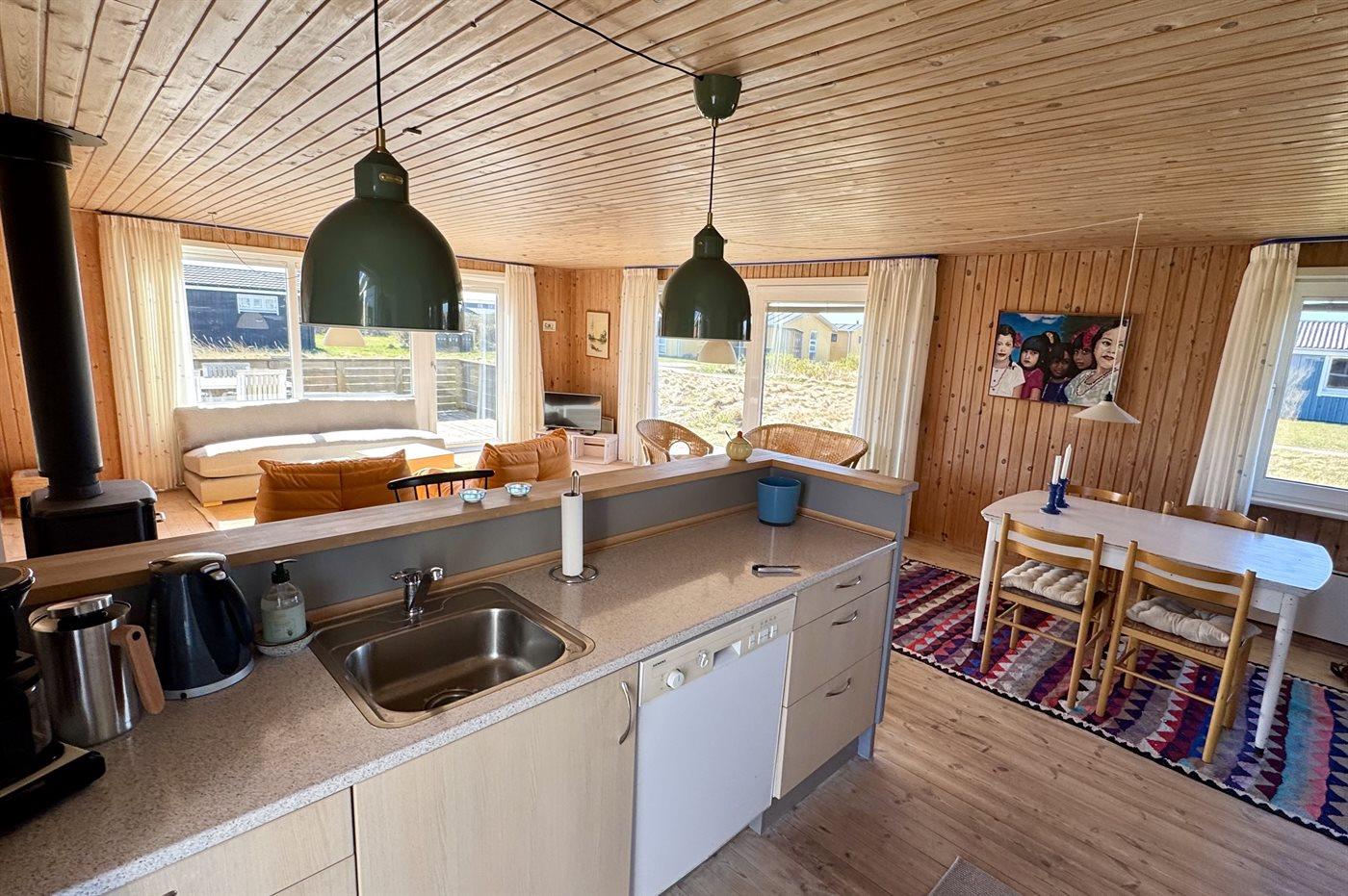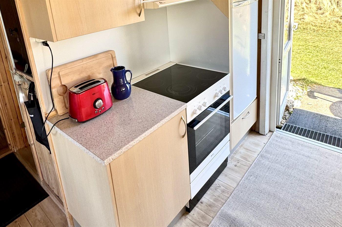 Køkkenet er udstyret med 1 køleskab. Der er 4 keramiske kogeplader, varmluftovn samt opvaskemaskine.