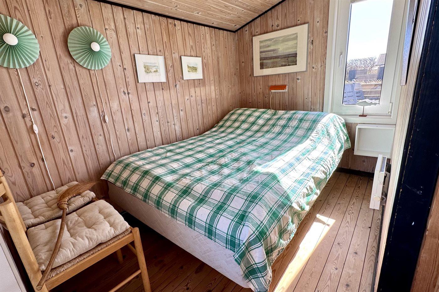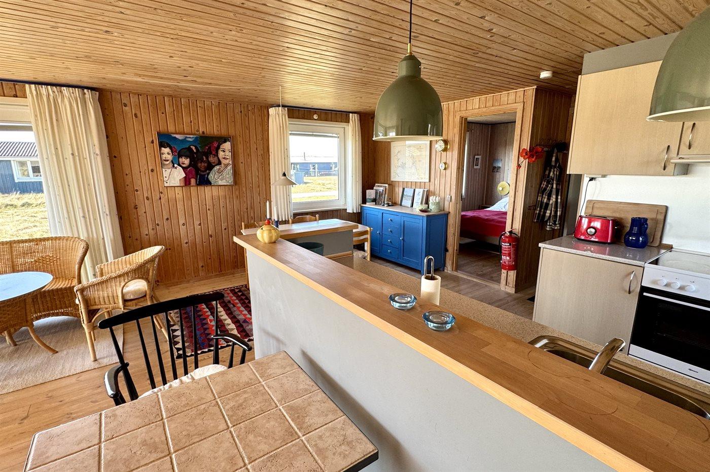 Rummeligt, helårsisoleret sommerhus med fyrretræsbeklædning.