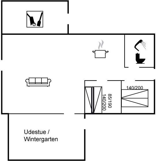 Der er i alt 2 soveværelser. Sovepladserne fordeler sig på: 4 sovepladser i dobbeltsenge.1 soveplads i køjeseng.