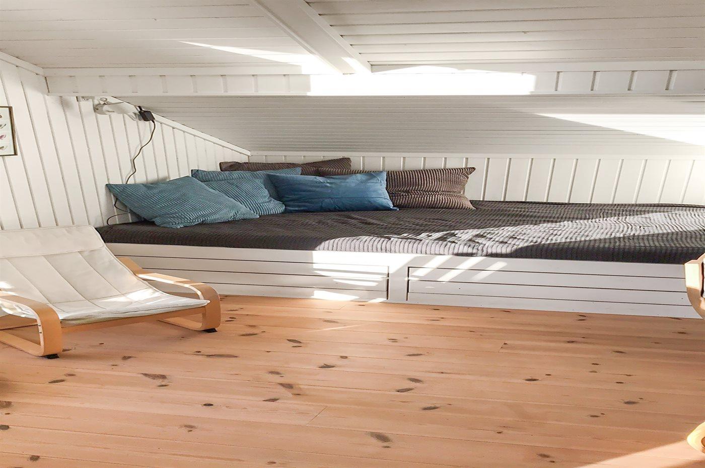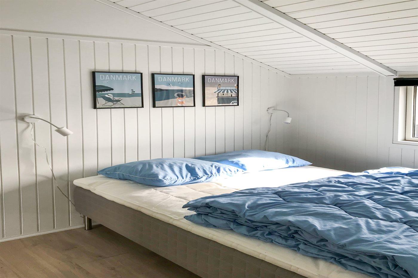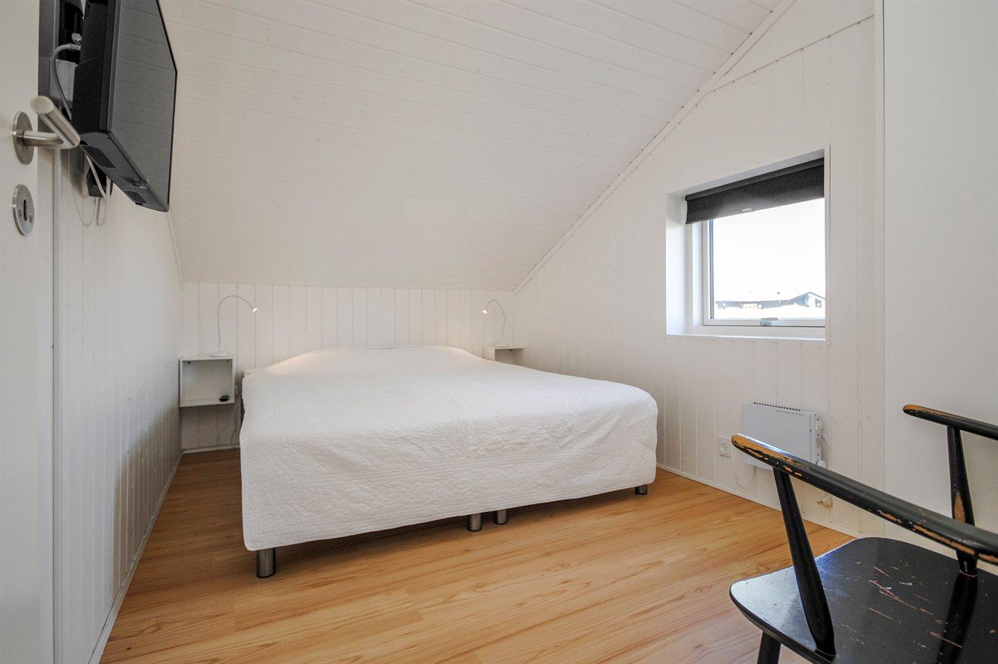 Soveværelse med 180 cm boxmadras og Sat-TV. Soverum med 140 cm boxmadras. Barneseng. Nyt badeværelse (2016) med WC, håndvask, bruser og gulvvarme. Bryggers med VASKEMASKINE og TØRRETUMBLER samt ekstra køleskab med 70 l. fryser.