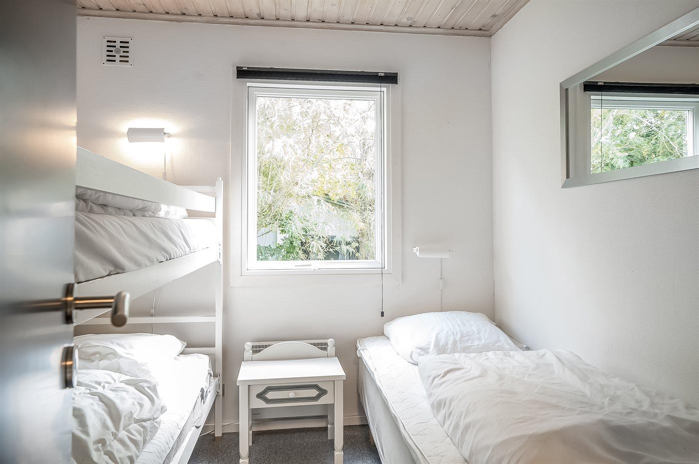 Der er i alt 2 soveværelser. Sovepladserne fordeler sig på: 3 sovepladser i enkeltsenge. 2 sovepladser i køjeseng.