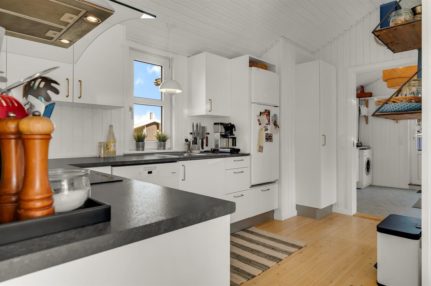 Køkkenet er udstyret med 1 køleskab. Der er 4 induktionskogeplader, varmluftovn samt opvaskemaskine.