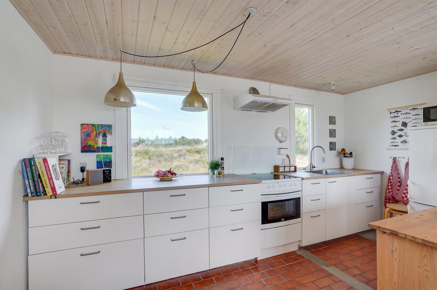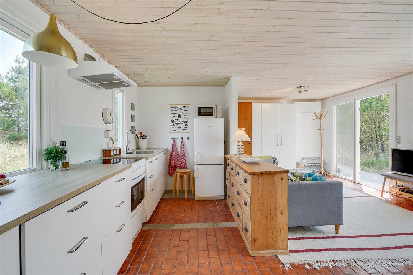 Køkkenet er udstyret med 1 køleskab og frysekapacitet på 60 liter. Der er 4 keramiske kogeplader og varmluftovn. Der er 1 badeværelse med gulvvarme, bruseniche og 1 toilet.