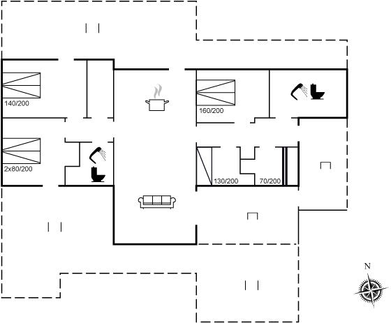 Der er i alt 5 soveværelser. Sovepladserne fordeler sig på: 6 sovepladser i dobbeltsenge. 1 soveplads i enkeltseng. 2 sovepladser i køjeseng.