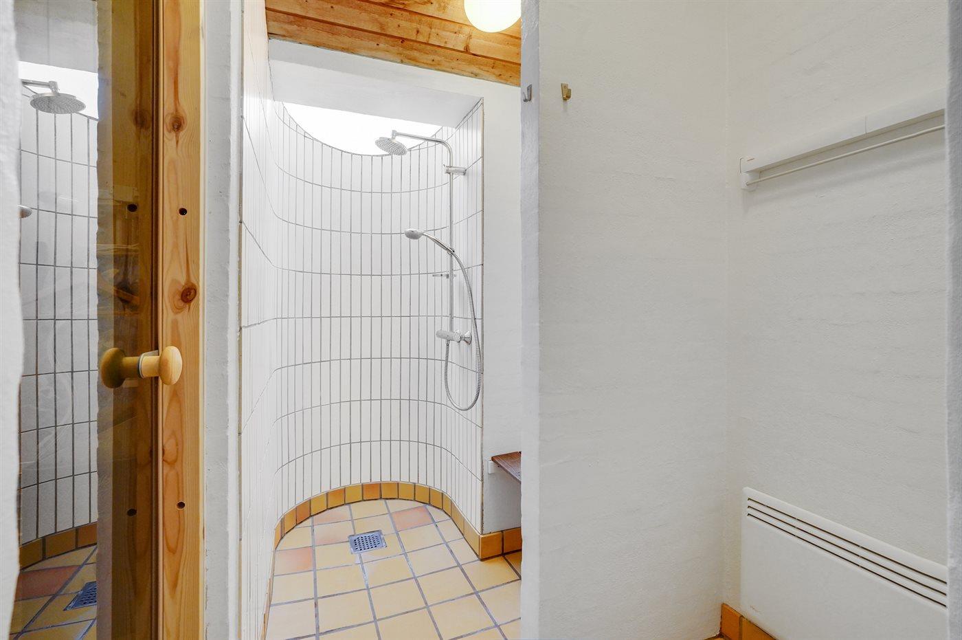 Der er 2 badeværelser med bruseniche og 2 toiletter. Der er gulvvarme på 2 badeværelser. I saunaen er der mulighed for afslapning.