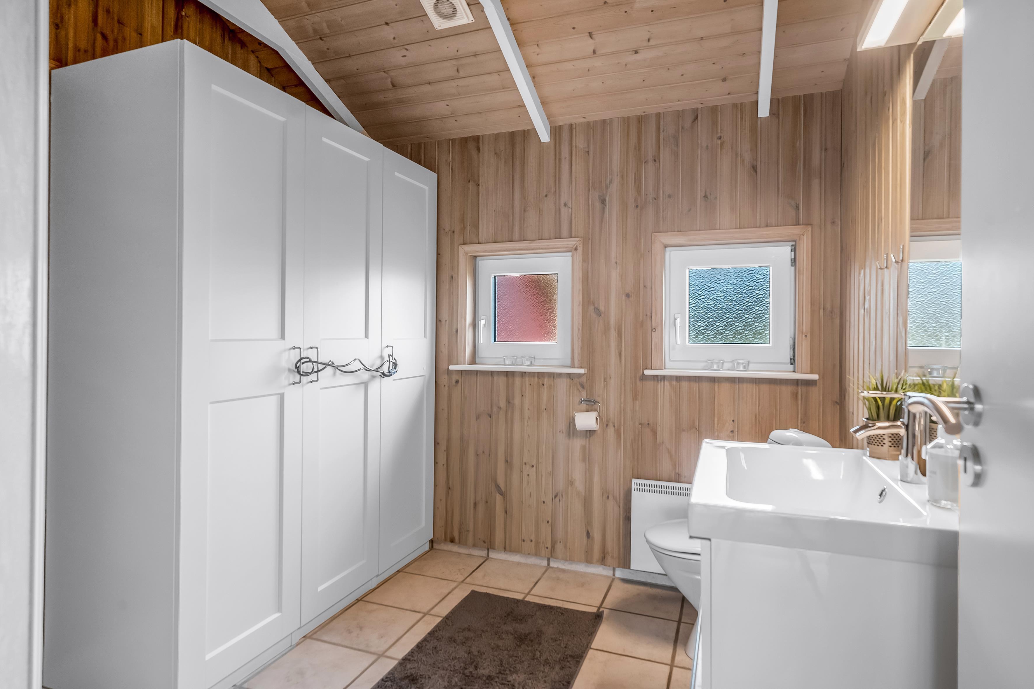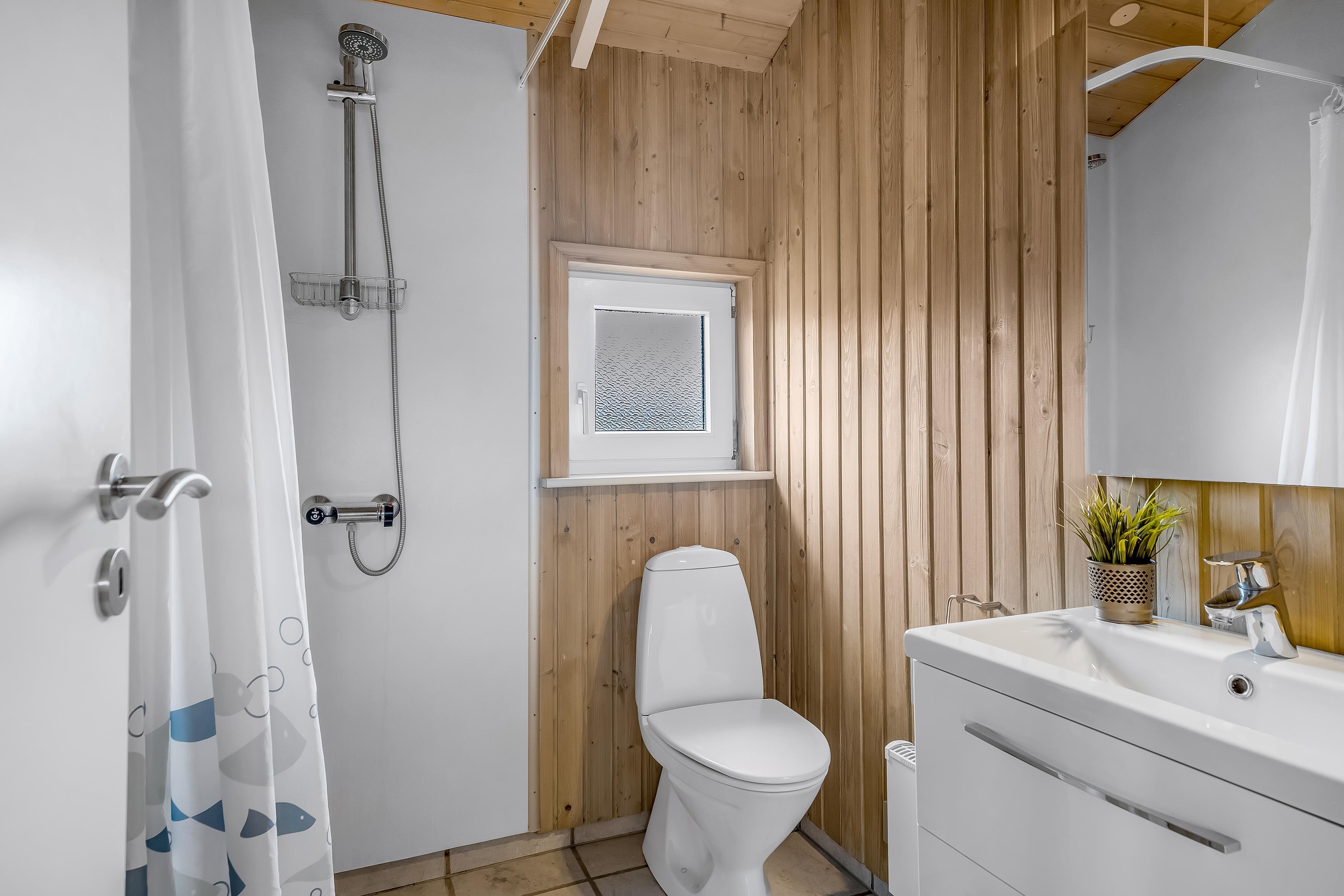Der er to badeværelser i boligen, begge med moderne faciliteter, herunder bruser, toilet og gulvvarme, hvilket sikrer en behagelig oplevelse selv på de kolde dage. For dem, der ønsker ekstra bekvemmelighed, er der også en energibesparende varmepumpe installeret, der også kan fungere som aircondition, så du kan tilpasse temperaturen efter dine behov.