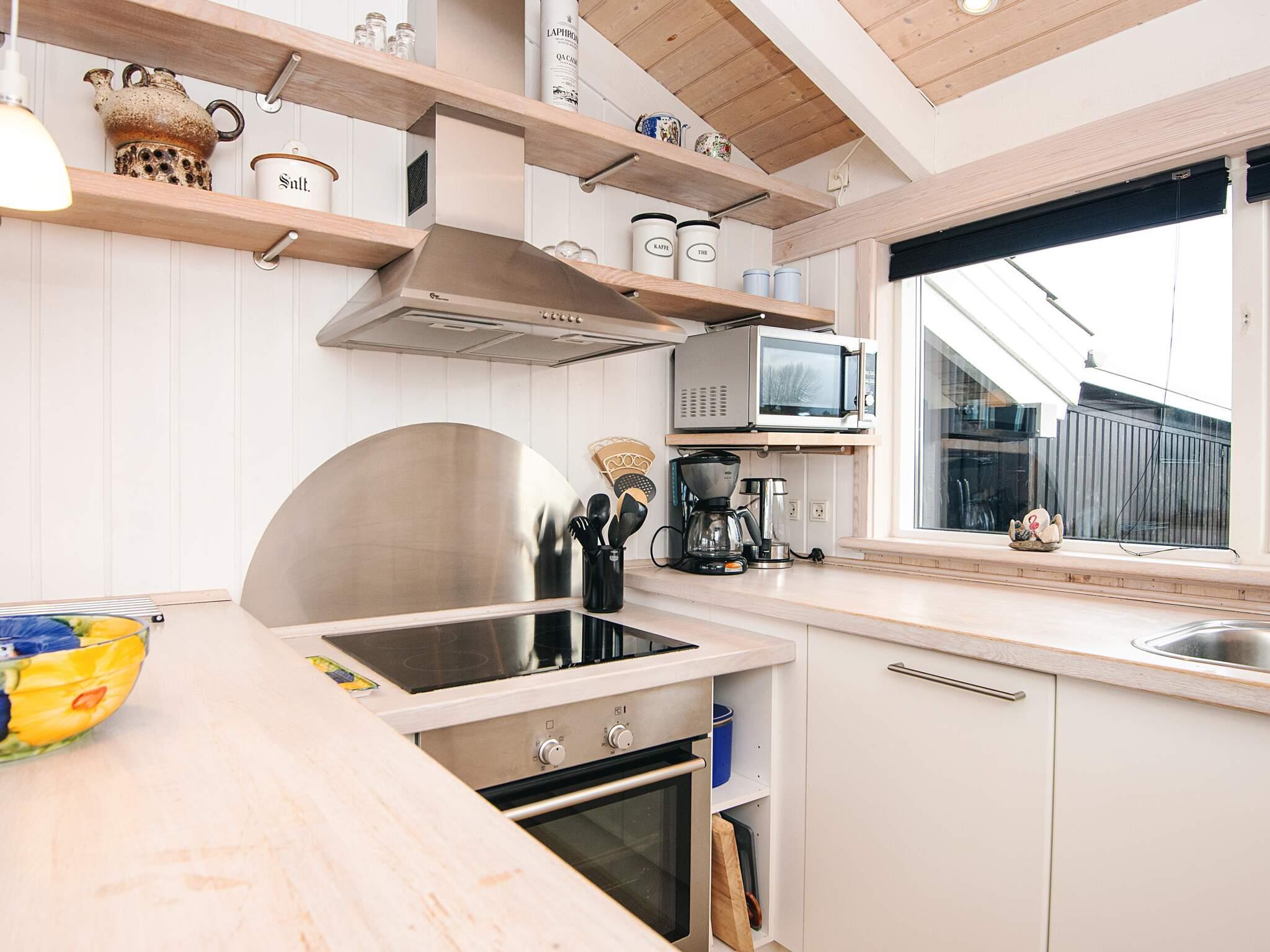 Køkkenet er veludstyret med bl.a. kaffemaskine, el-komfur med ovn, induktionskomfur, køleskab med frostboks og opvaskemaskine.