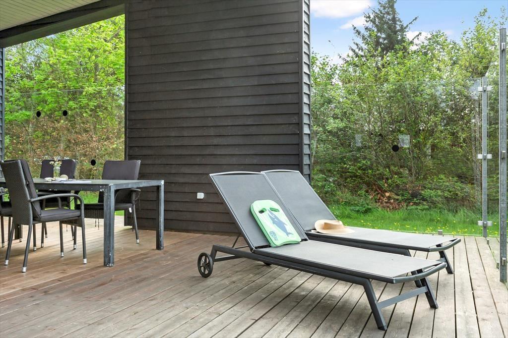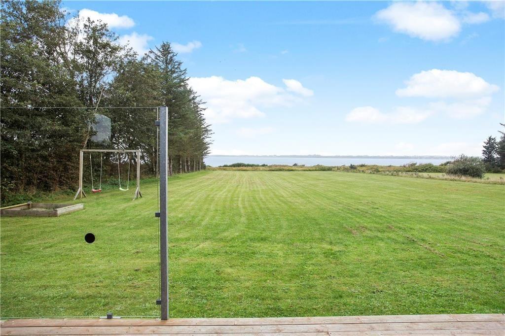 Udendørsbruseren er del af husets flotte og delvist overdækkede terrassemiljø, der vender ud mod fjorden. Foran huset er der carport og et grusbelagt parkeringsareal, mens baghavens græsplæne strækker sig helt ned til stranden. Grunden er stor, så der er masser af plads til leg og boldspil, og med gynger, sandkasse og petanquebane er der aktivitetsmuligheder for hele familien.