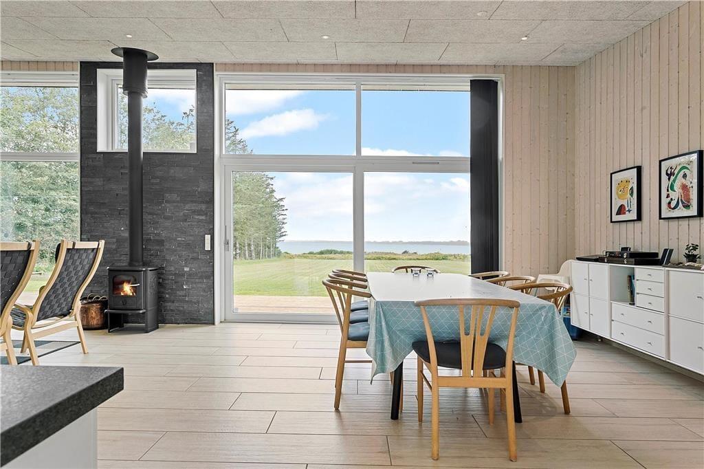 Den attraktive adresse i første parket til vandet er kun en af mange kvaliteter, for huset er nemlig et rummeligt og velindrettet eksemplar på 135 m2. Opførelsesåret er 2016, og som det kan forventes af et moderne byggeri, er det fyldt med mange lækre detaljer – også de knap så synlige, for der er eksempelvis lynhurtig internetforbindelse, gulvvarme overalt og tilmed indlagt jordvarme, der sørger for gratis opvarmning af huset. Møblementet passer godt ind i de indbydende rum, der har en lys og let atmosfære takket være de store vinduespartier. Det er naturligvis også panoramavinduerne, der giver jer mulighed for at nyde fjordudsigten, uanset om I slapper af i sofaen nær brændeovnen, sidder samlet ved spisebordet eller står i opholdsrummets åbne køkken. Et af husets tre soveværelser vender sågar ud mod vandet, og på det største af de to badeværelser giver en havedør jer direkte adgang til terrassen, så I kan kombinere spabad og saunatur med et opkvikkende styrtebad under den udendørs bruser.