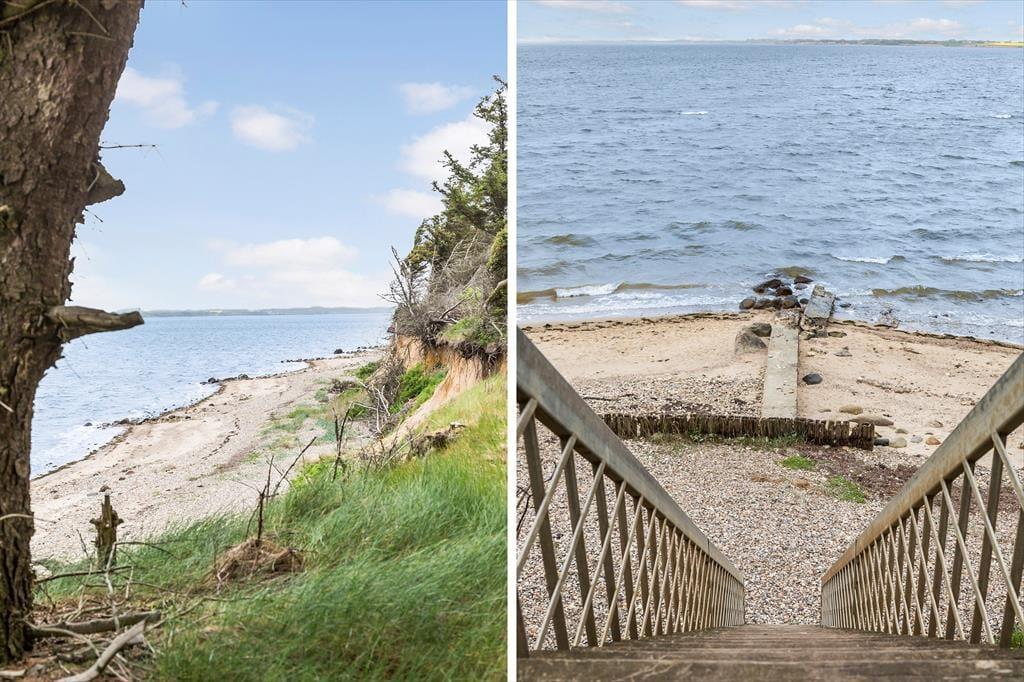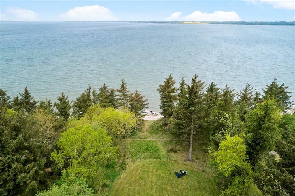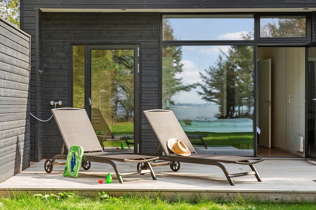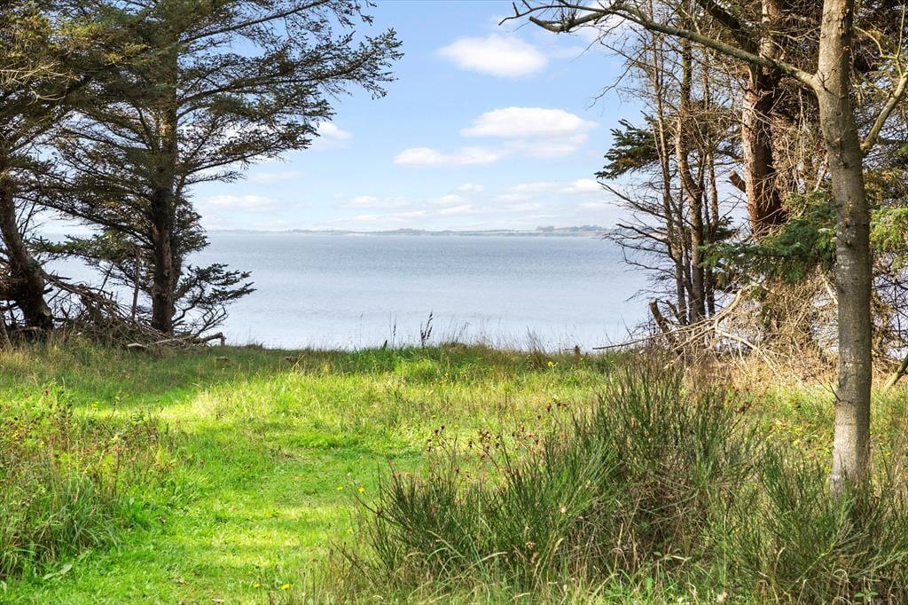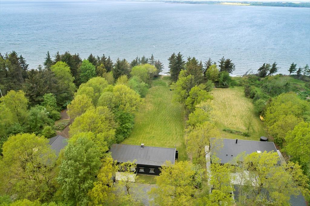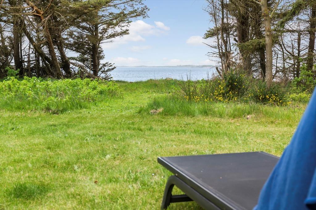 Den 2788 m2 store grund byder på en stor græsplæne og høje træer, der omkranser udearealerne. Der er dog en åbning i bevoksningen mod vest, så I kan se lige ud på vandet fra både sommerhuset og den vestvendt terrasse. En del af terrassen er overdækket, og i det ene hjørne er der en niche med udendørs bruser, så I kan tage morgenbad til lyden af fuglesang.