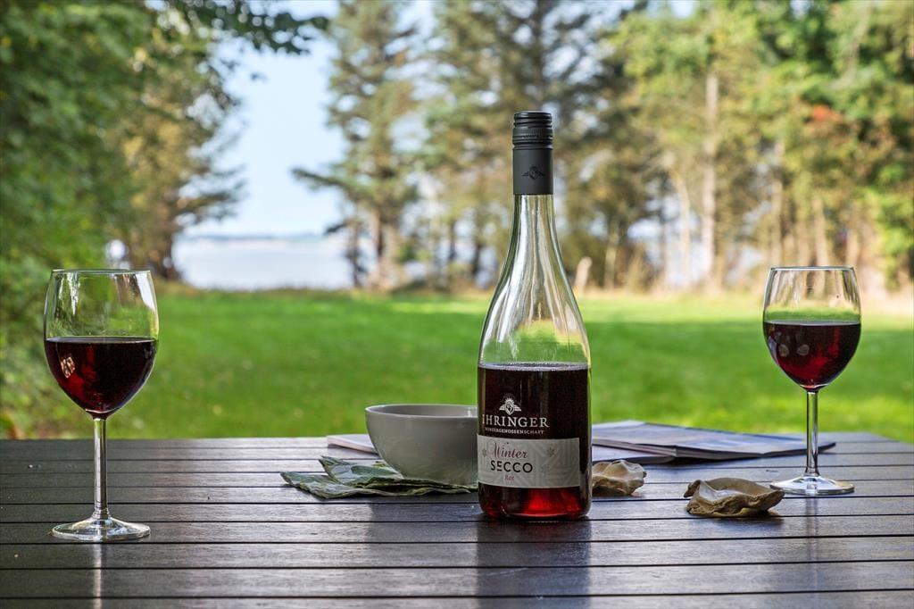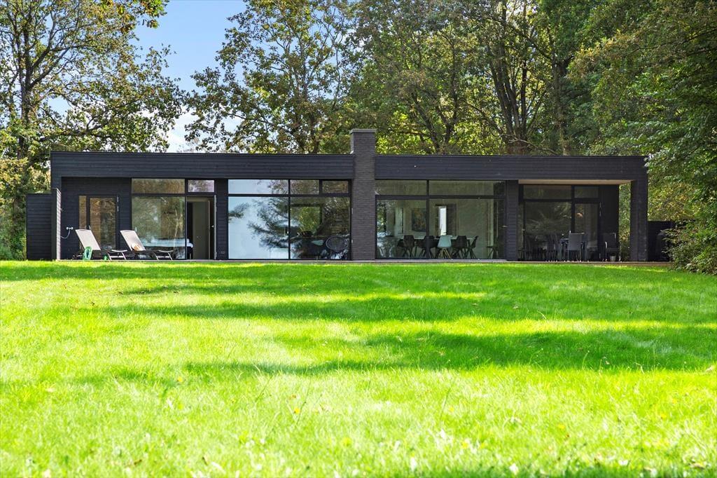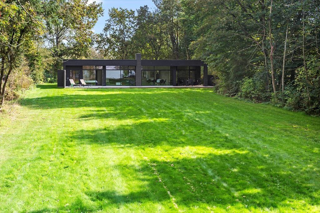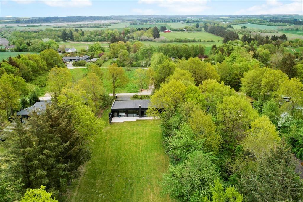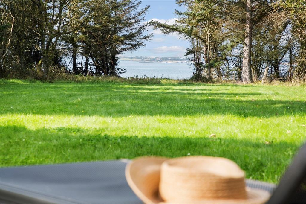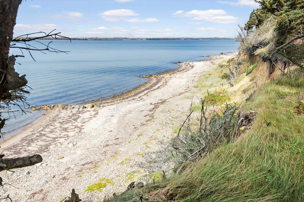 Den 2788 m2 store grund byder på en stor græsplæne og høje træer, der omkranser udearealerne. Der er dog en åbning i bevoksningen mod vest, så I kan se lige ud på vandet fra både sommerhuset og den vestvendt terrasse. En del af terrassen er overdækket, og i det ene hjørne er der en niche med udendørs bruser, så I kan tage morgenbad til lyden af fuglesang.