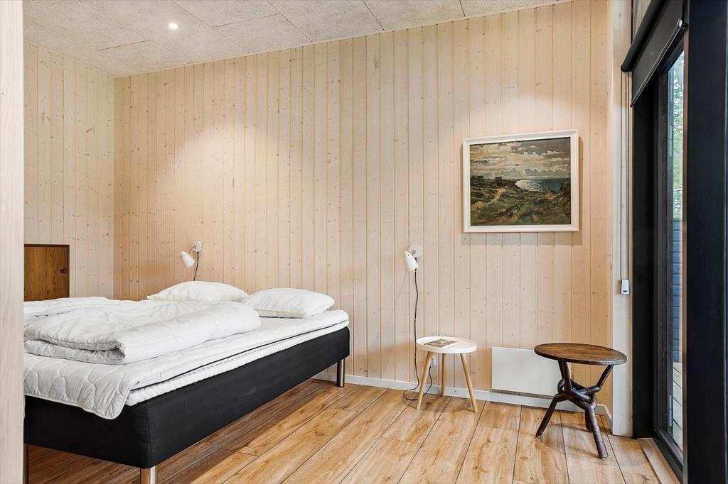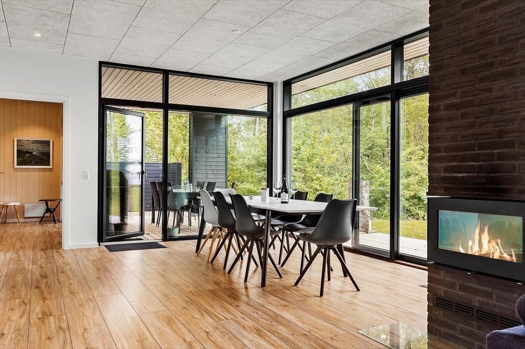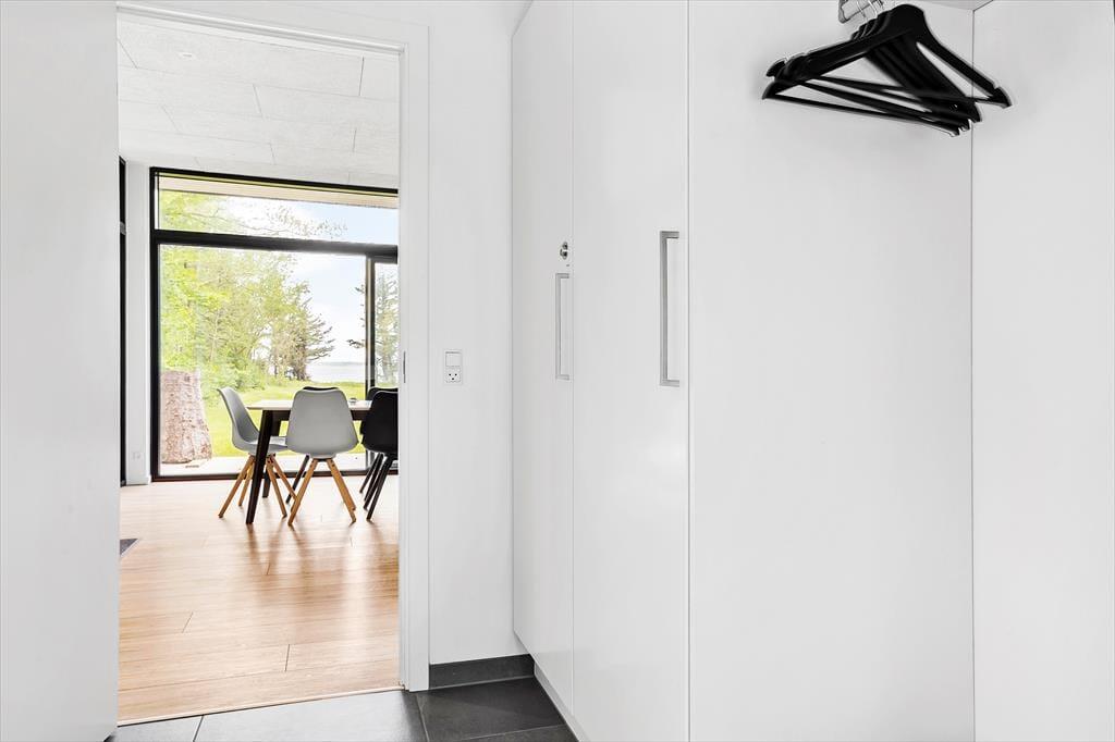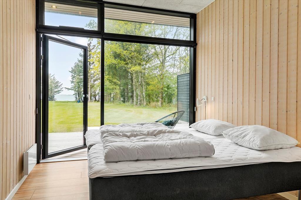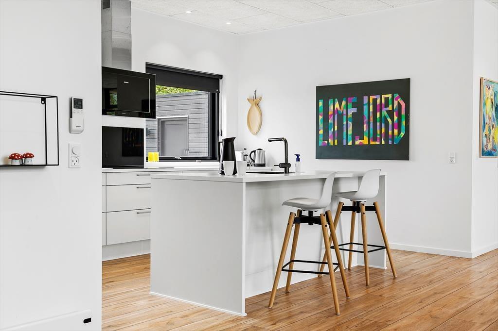 Ferien kommer til at udspille sig i moderne og rummelige rammer, for det 141 m2 store sommerhus er opført i 2019 og indrettet på stilfuld vis. Der er dobbeltseng på alle fire soveværelser, og på to af dem er der derudover en køje ovenover, så det er muligt at samle venner eller familie til en god fællesferie. Ved entréen ligger et badeværelse med vaskemaskine og tørretumbler, mens husets andet badeværelse har dør ind til en sauna og videre ud til terrassens udebruser. Det er herligt at kunne slappe af i den varme sauna efter en tur til fjorden – men mon ikke I kommer til at tilbringe endnu flere timer i sommerhusets smukke opholdsrum, hvor stue og køkken er forenet. Her er der alt, hvad I skal bruge, inklusiv indbygningspejs, varmepumpe med køling og fladskærms-tv, men det allerbedste er nu næsten de store, vestvendte vinduespartier, der inviterer solen og limfjordsudsigten indenfor.
