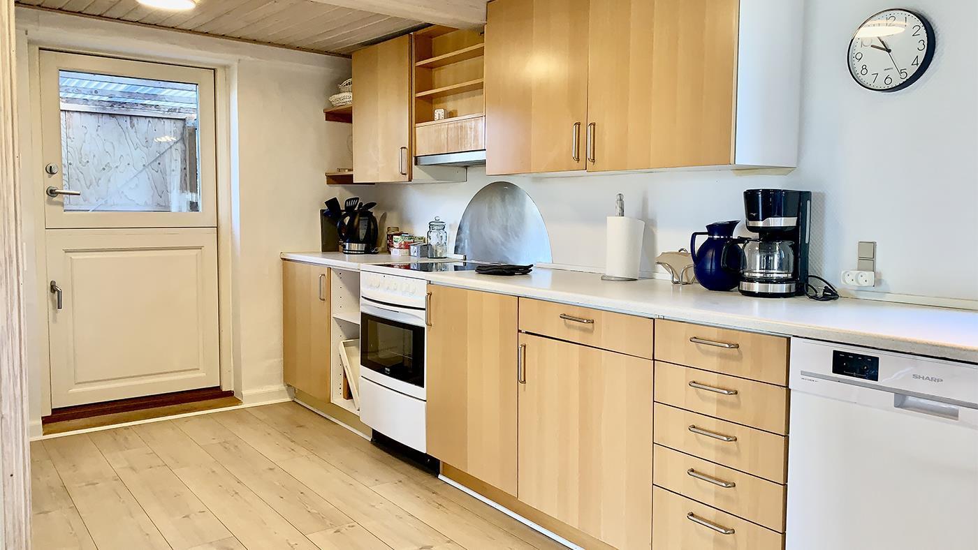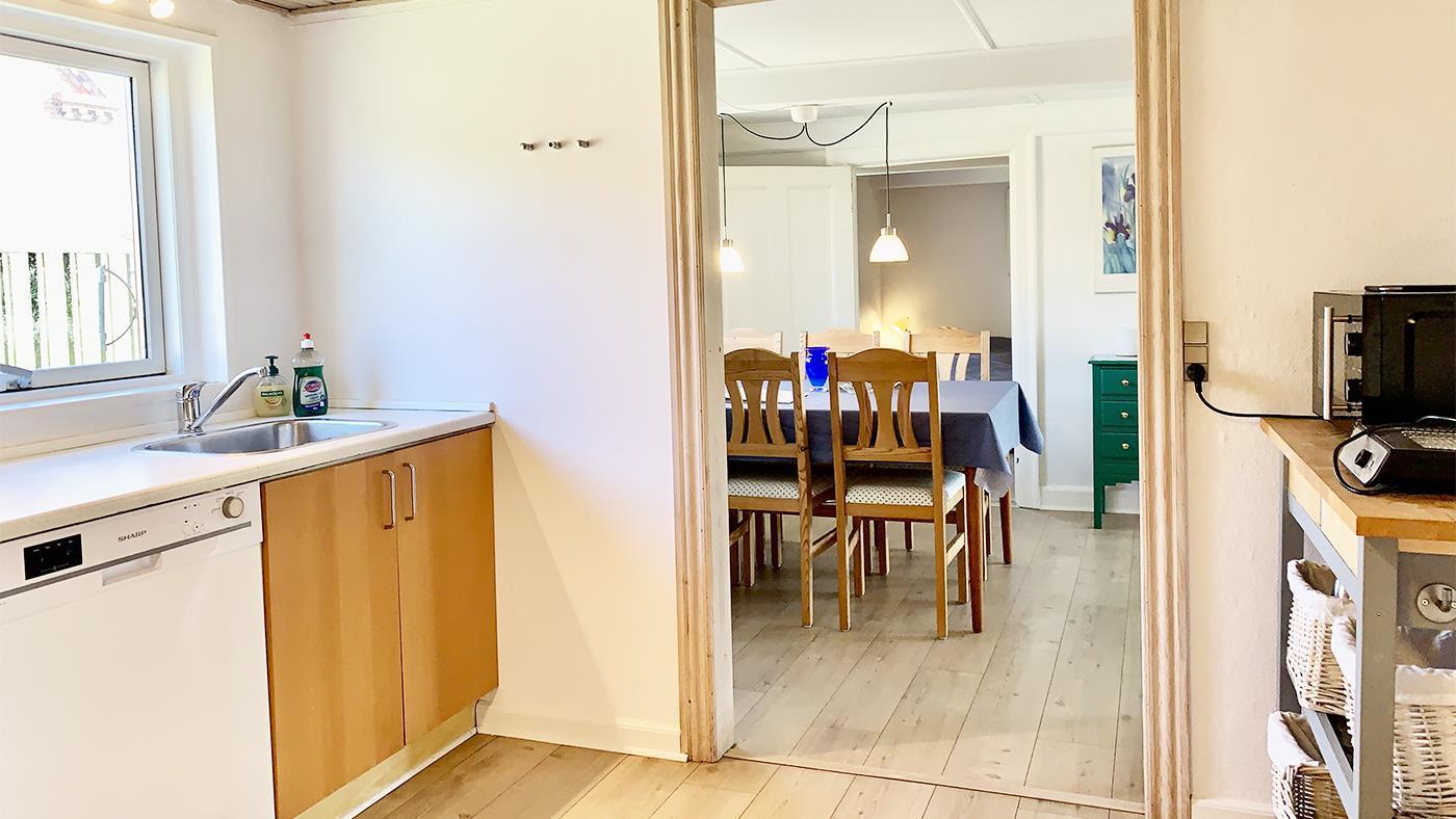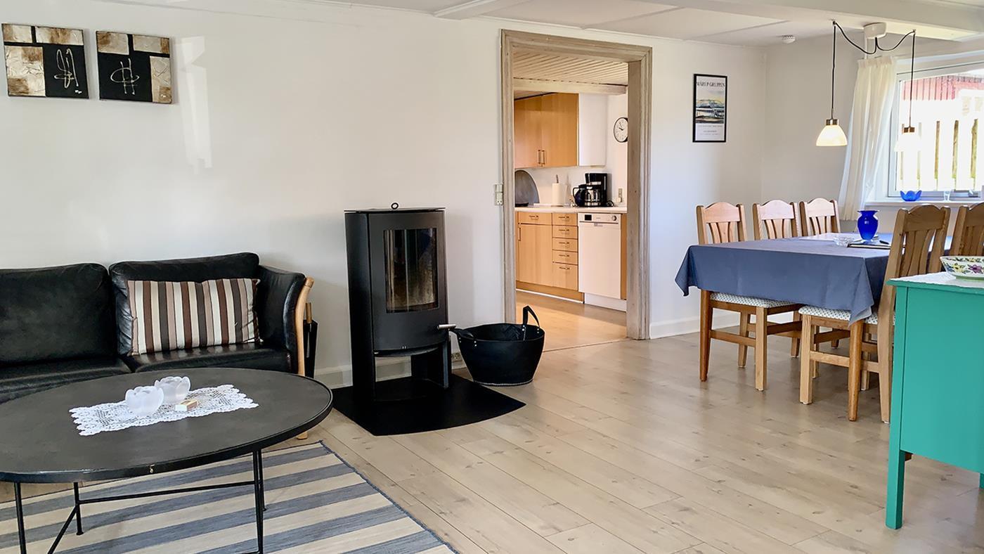 Ferieboligen er lyst og indbydende indrettet og rummer alt, hvad I har brug for til et afslappende ophold. Det pæne og funktionelle køkken ligger i åben forbindelse med en stor spise- og opholdsstue, hvor brændeovnen spreder en dejlig varme og skaber den helt rigtige feriestemning.