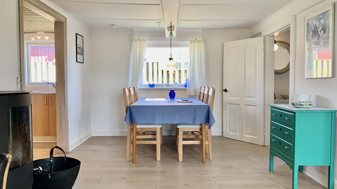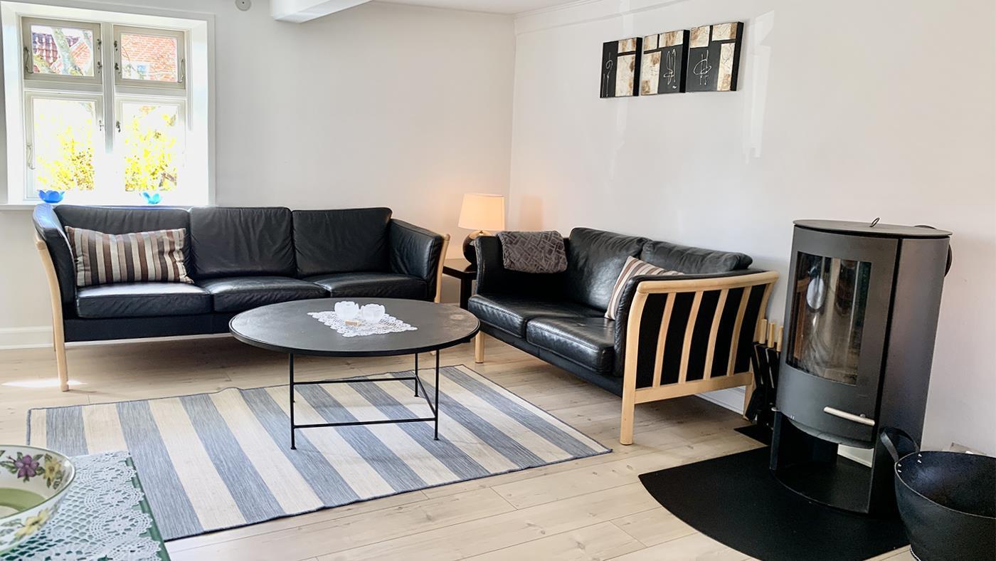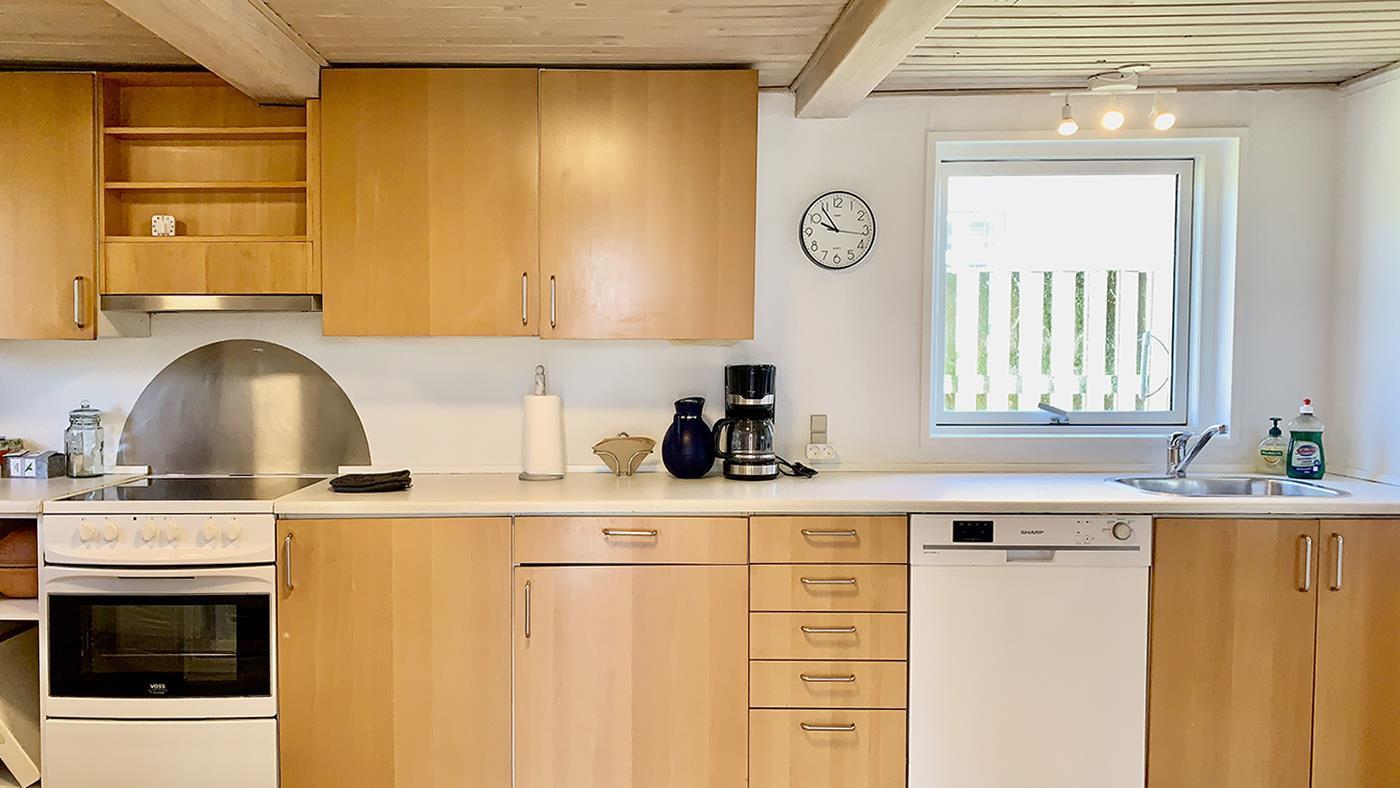 Ferieboligen er lyst og indbydende indrettet og rummer alt, hvad I har brug for til et afslappende ophold. Det pæne og funktionelle køkken ligger i åben forbindelse med en stor spise- og opholdsstue, hvor brændeovnen spreder en dejlig varme og skaber den helt rigtige feriestemning.