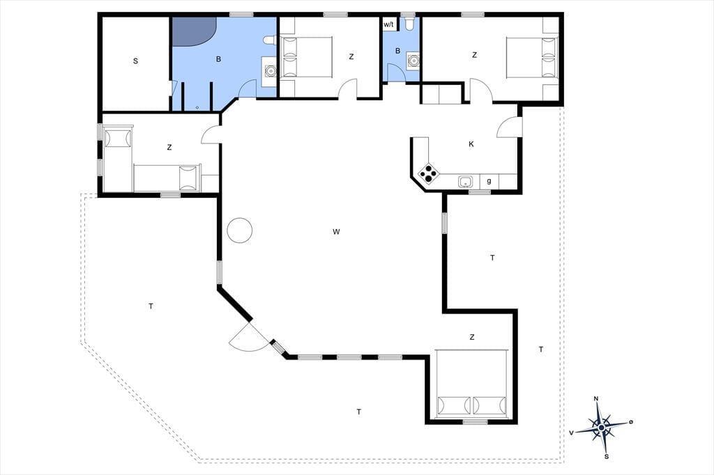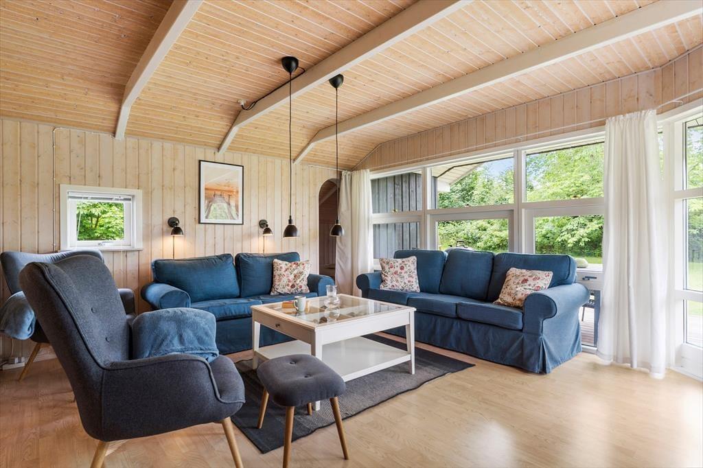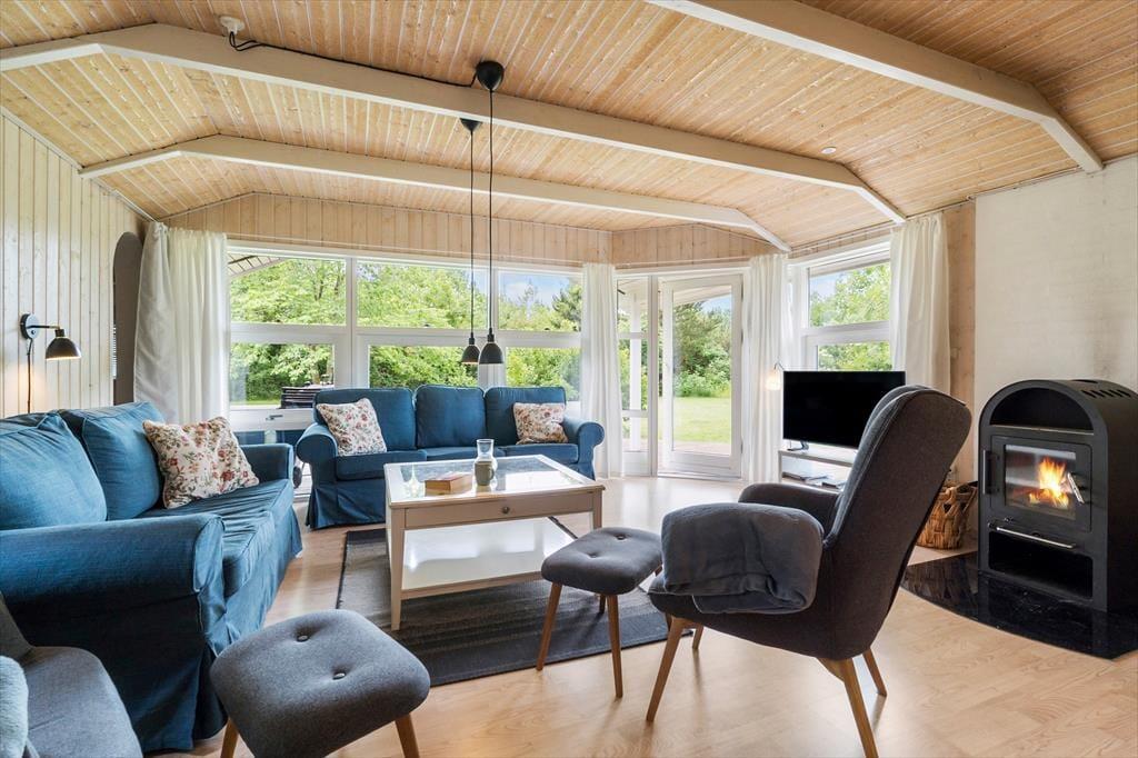 Sommerhuset er både flot og praktisk indrettet og her er plads til en stor familie. Man kommer ind gennem det veludstyrede køkken, som ligger i åben forbindelse med det store opholdsrum. Her kan hele familien samles til madlavning, hyggelige måltider og afslapning foran tv’et med ild i den flotte brændeovn. Rummet har et skønt lysindfald fra de store vinduer, og i det ene hjørne kan børnene lege hule eller tage en middagslur i den indbyggede alkove. Derudover råder sommerhuset over tre soveværelser, et gæstetoilet med vaskemaskine, og et stort og lækkert badeværelse, hvor man kan koble helt af i spabadet eller saunaen. Sommerhuset har installeret et gratis og trådløst internet, så medbring gerne pc eller tablet hjemmefra, så det er nemt at finde oplysninger om områdets mange muligheder.