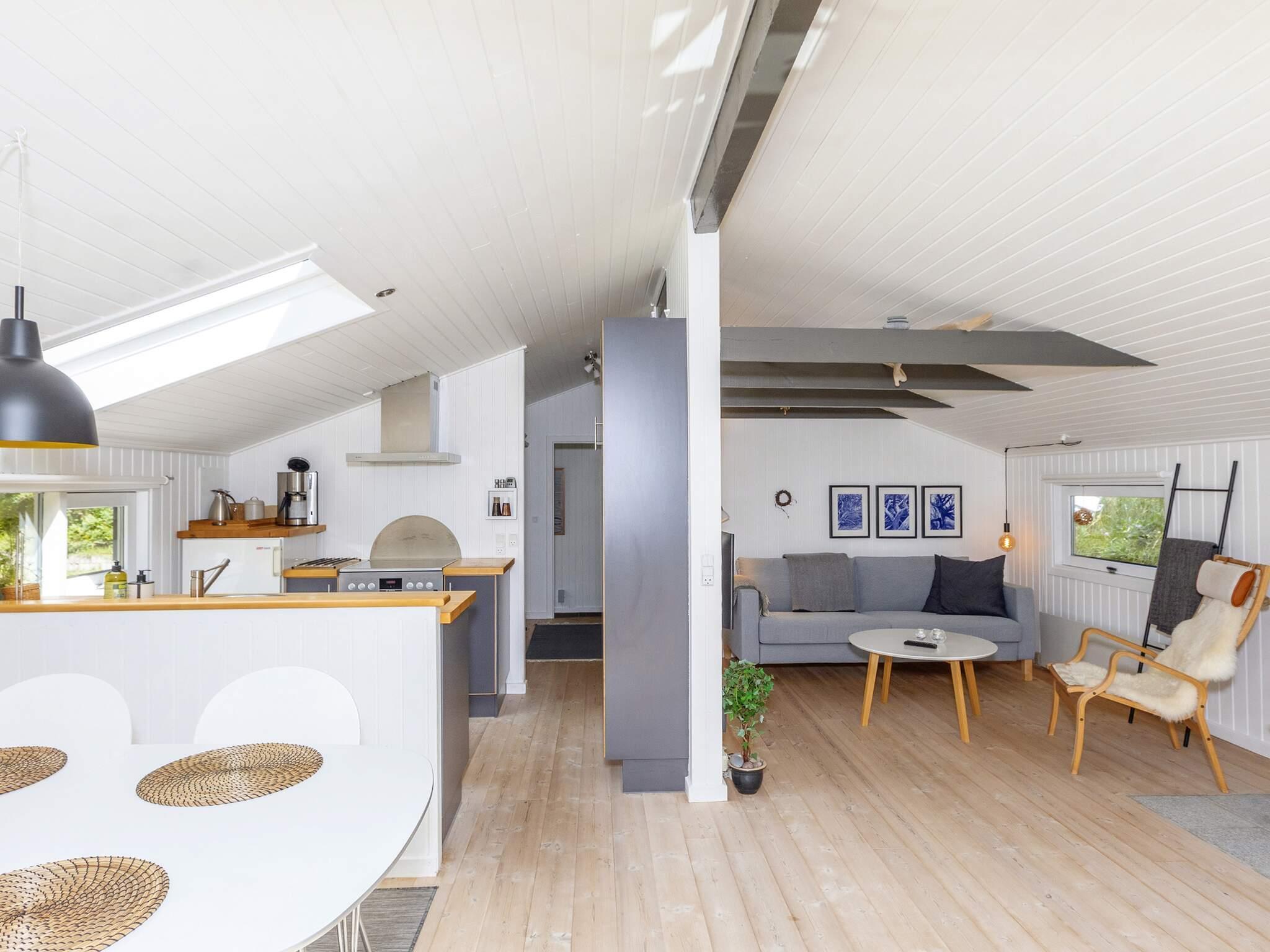 Det rummelige, lyse stuekøkken danner hjemmets hjerte. Familieværelset har højt til loftet, en hyggelig brændeovn og en lun sovekrog til én person. Det åbne køkken og spiseplads med ovenlys skaber et indbydende rum til madlavning, måltider og familiesammenkomster. Store vinduer i gavlen fylder rummet med naturligt lys og giver en behagelig udsigt over det omkringliggende grønne område, der bringer det udendørs ind.