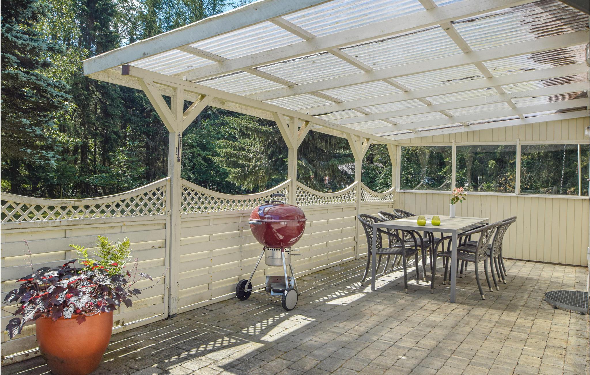 Grunden er stor og beplantet med træer, der er en fin overdækket terrasse, hvor hyggelige aftener med grillmiddage og de lyse sommeraftener kan tilbringes. På grunden findes også en god legeplads til børnene, der er vippe, gynge, sandkasse og et legehus, så der er mulighed for mange timers leg, mens de voksne slapper af og nyder ferien.