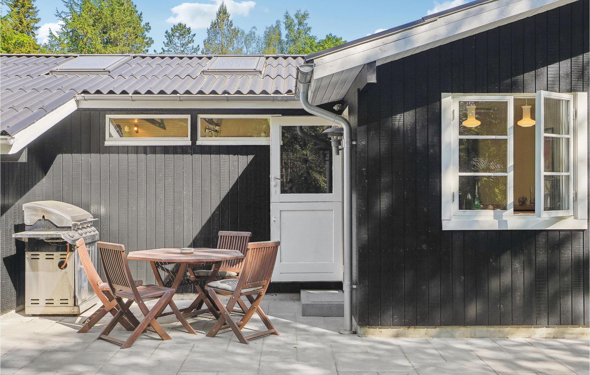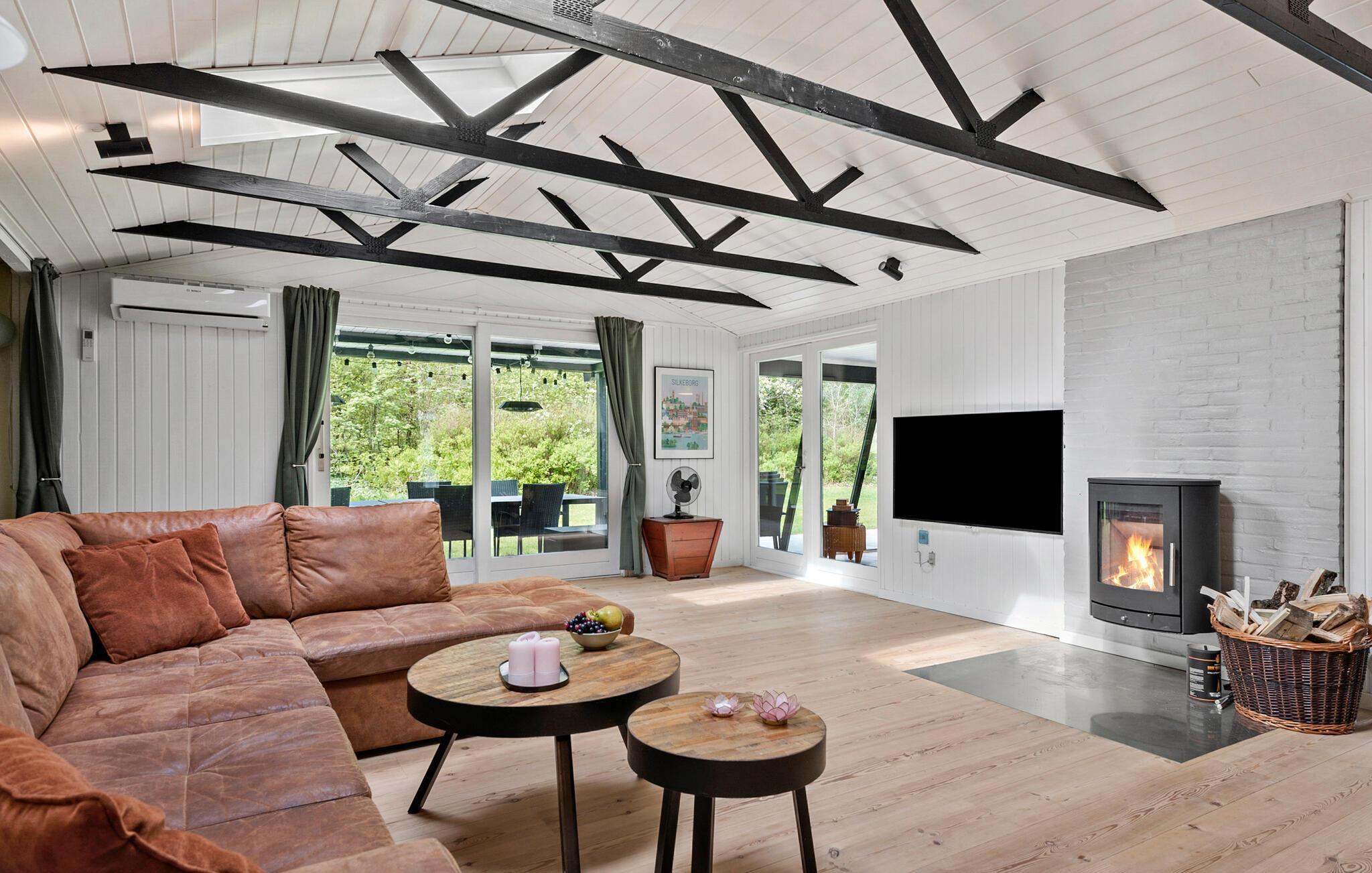 Det komfortable hus byder jer velkommen med en smuk beliggenhed på en grund omgivet af træer. De lyse værelser med rolige farver og dekorative bjælker i opholdsstuen skaber en hyggelig ramme, hvor I kan glemme hverdagens stress og i stedet slappe af til en smuk udsigt over naturen gennem de store panoramavinduer. Sæt jer godt til rette med en film på sofaen, hyg med Uno ved det lange spisebord og nyd ferieaftenerne, mens I sludrer til sent ud på natten ved brændeovnen. Slik sol i haven og spil alletiders fodboldkamp på den enorme græsplæne. En dejlig grillaften på terrassen er altid en fornøjelse for hele familien.