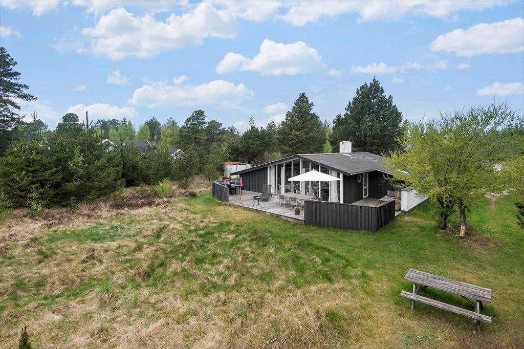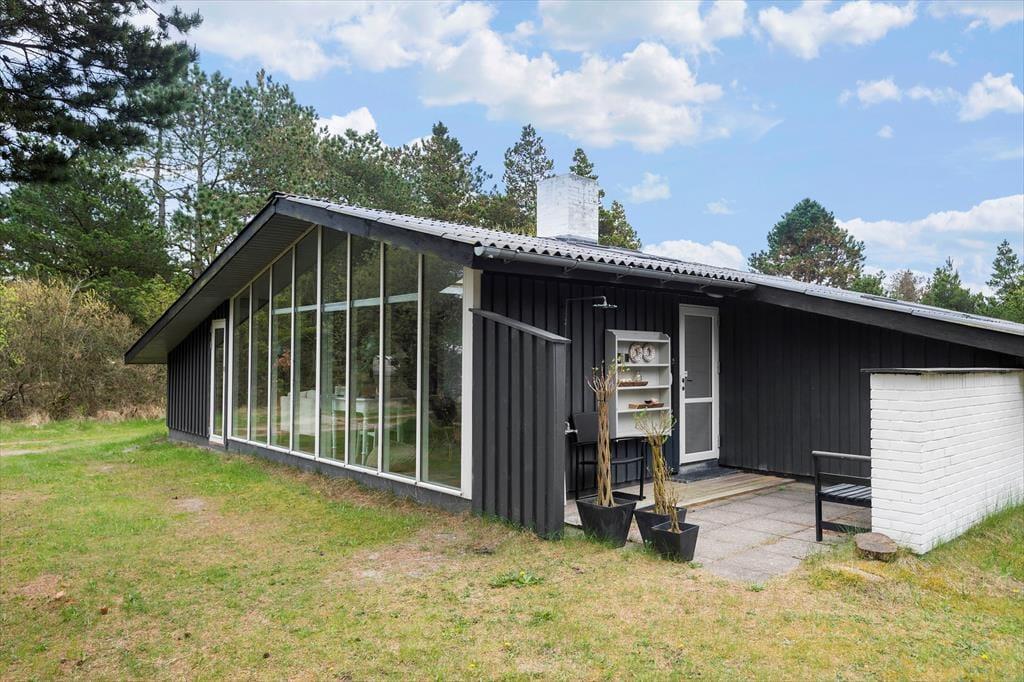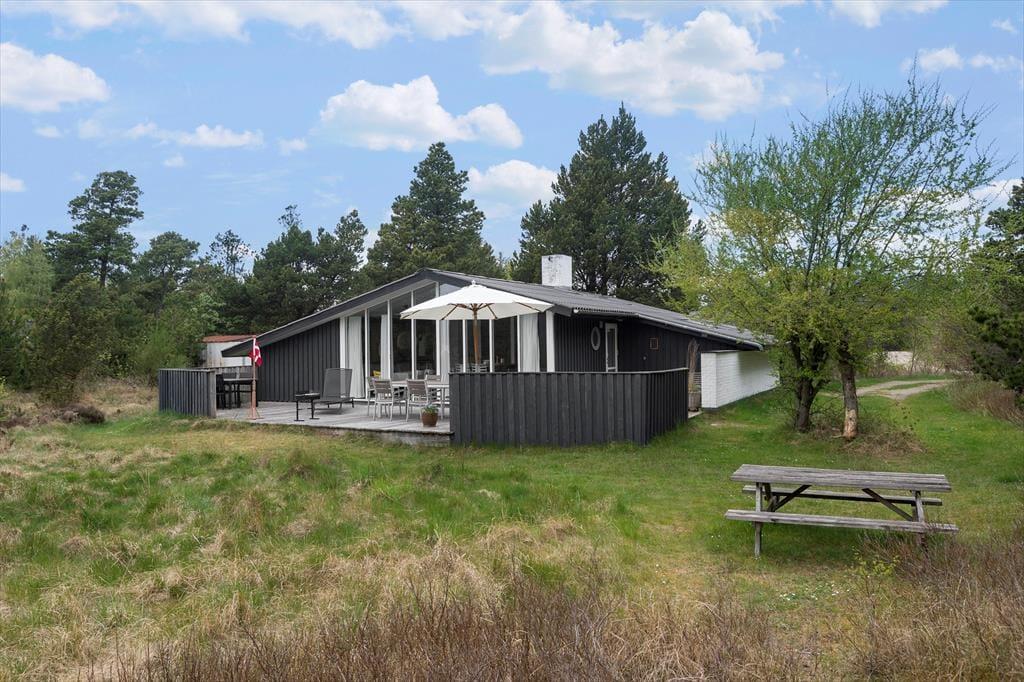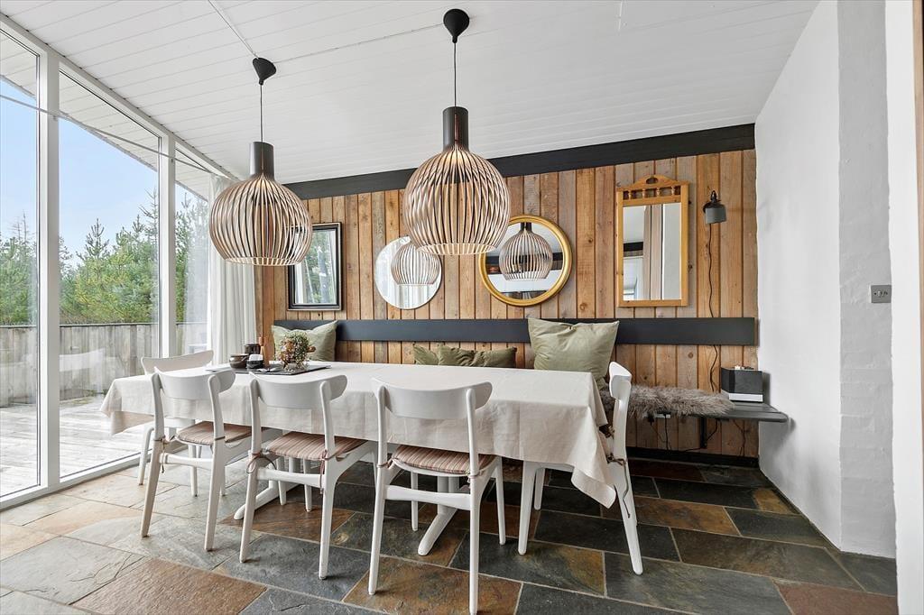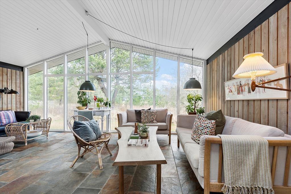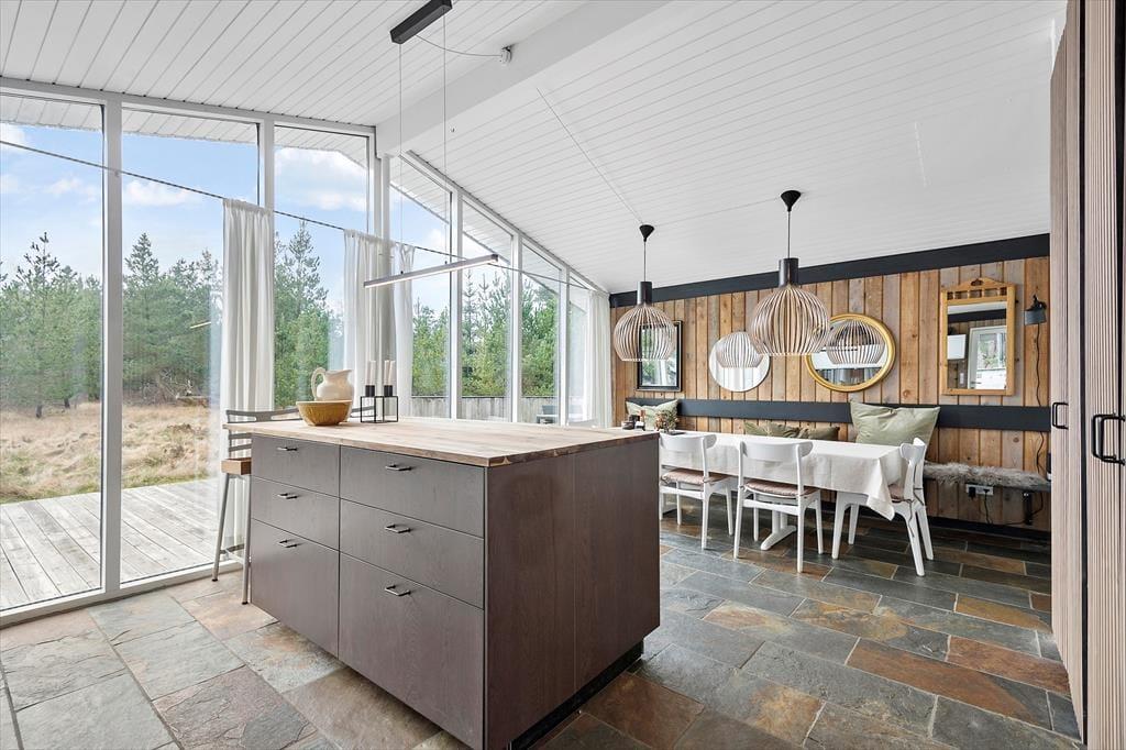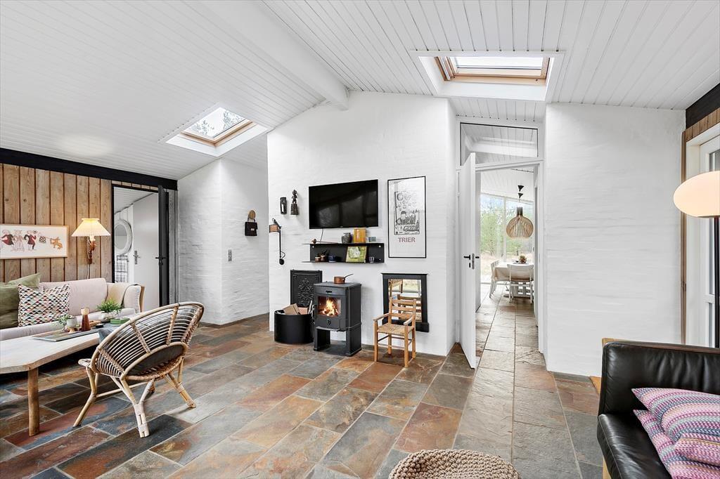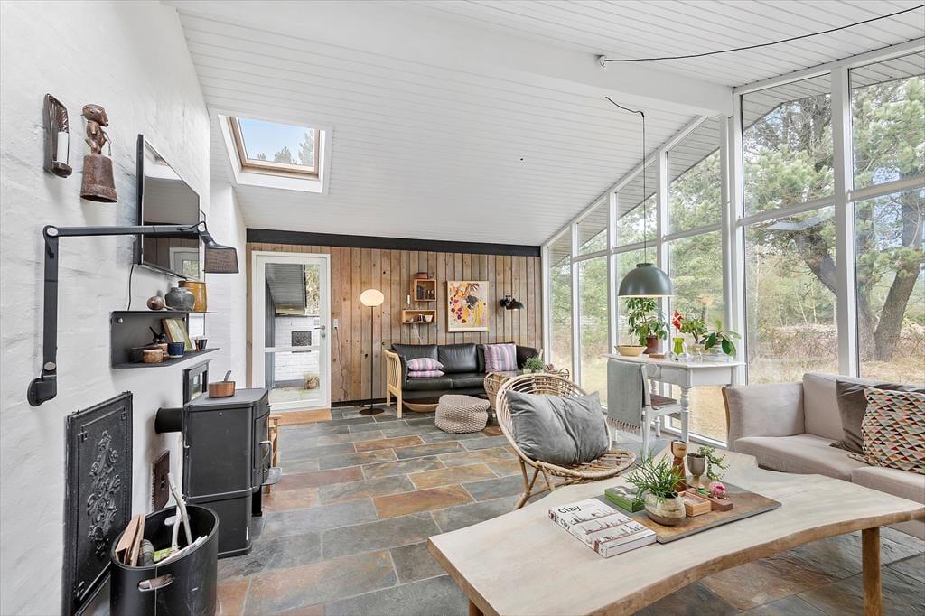 Her på adressen befinder vi os meget langt fra typehuse og anonyme ferieboliger, for det 140 m2 store sommerhus er nemlig blevet indrettet på særdeles original og stilfuld vis. Rumfordelingen skiller sig også ud fra mængden: Køkken-alrum og stue ligger i hver sin ende af huset, men er samtidig godt forbundet af et gangareal. De to opholdsrum har begge et flot stengulv med indlagt varme og rustikke trælister på væggene, og gavlvinduer fra gulv til loft sørger for et smukt lysindfald og uhindret udsigt til naturgrunden. Centralt i huset ligger et badeværelse og et gæstetoilet, og endelig hører tre dejlige soveværelser og en rummelig entré med vaskemaskine også med til planløsningen.