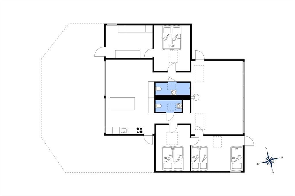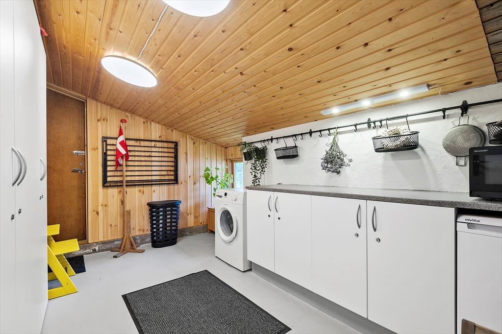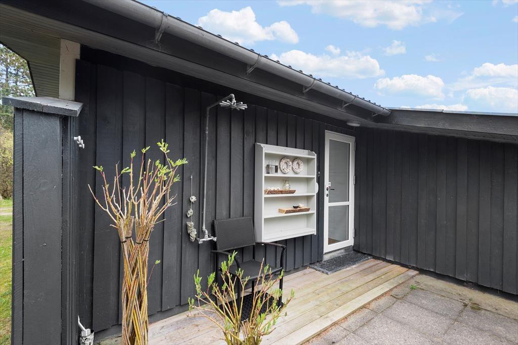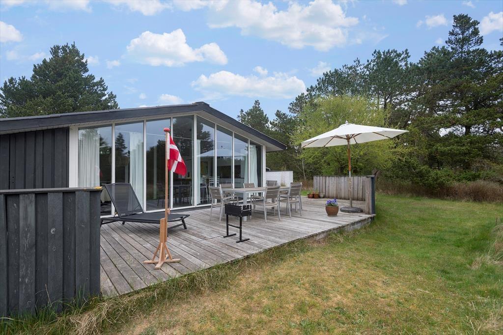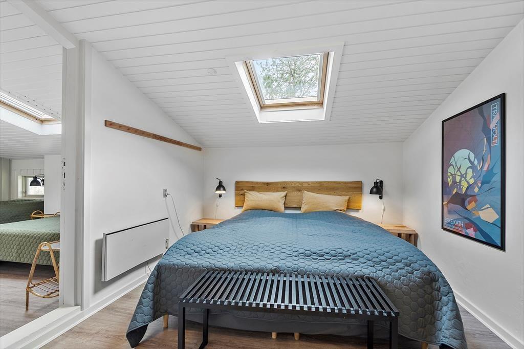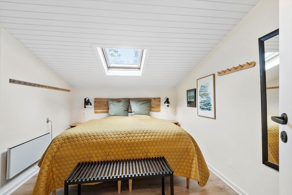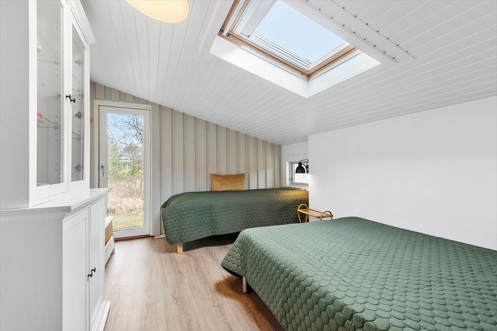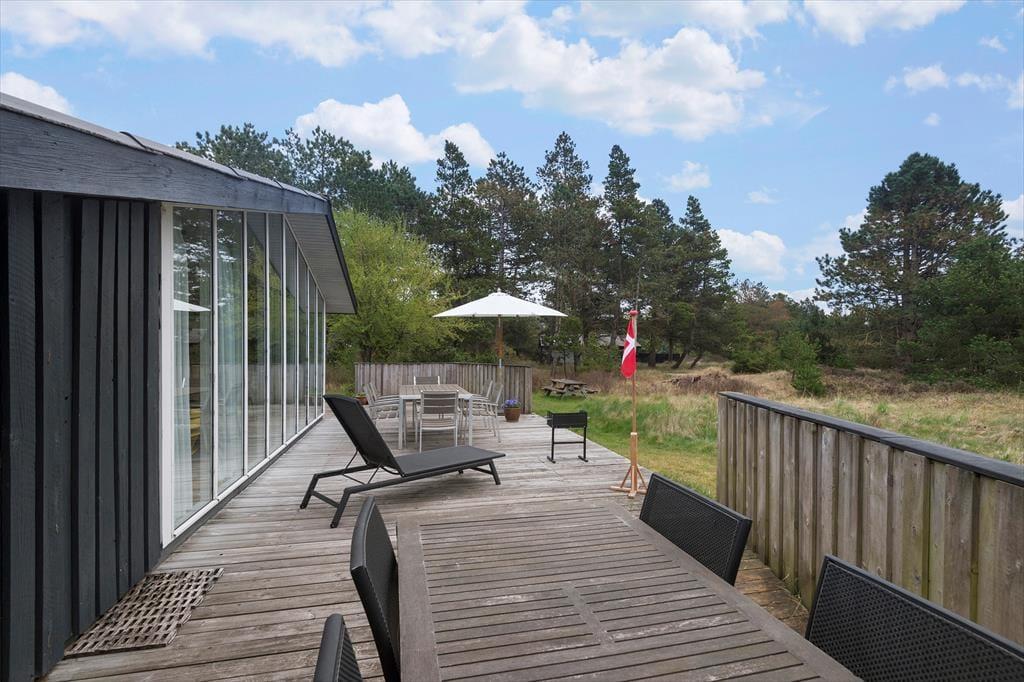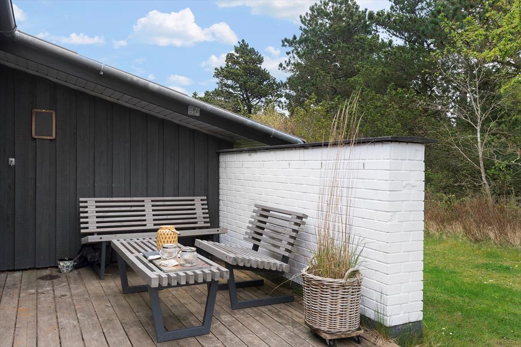 Her på adressen befinder vi os meget langt fra typehuse og anonyme ferieboliger, for det 140 m2 store sommerhus er nemlig blevet indrettet på særdeles original og stilfuld vis. Rumfordelingen skiller sig også ud fra mængden: Køkken-alrum og stue ligger i hver sin ende af huset, men er samtidig godt forbundet af et gangareal. De to opholdsrum har begge et flot stengulv med indlagt varme og rustikke trælister på væggene, og gavlvinduer fra gulv til loft sørger for et smukt lysindfald og uhindret udsigt til naturgrunden. Centralt i huset ligger et badeværelse og et gæstetoilet, og endelig hører tre dejlige soveværelser og en rummelig entré med vaskemaskine også med til planløsningen.