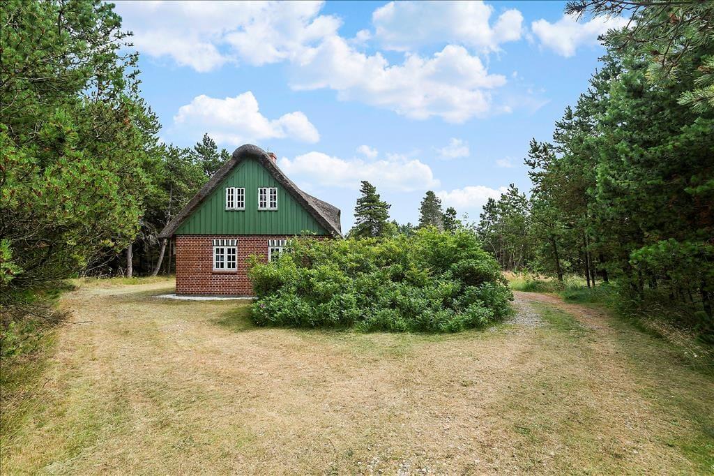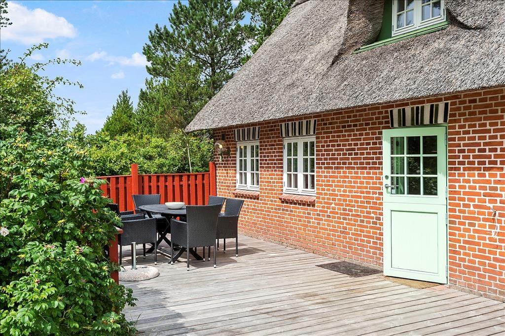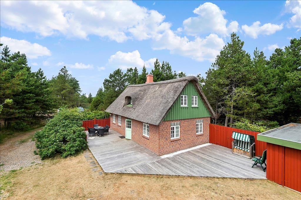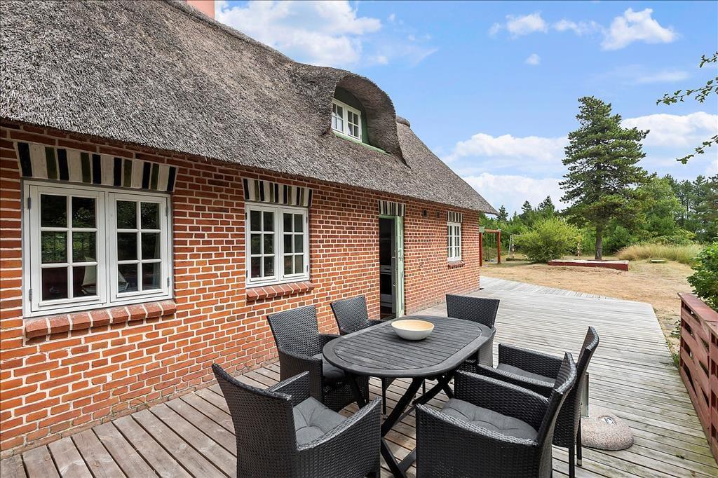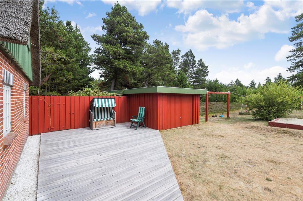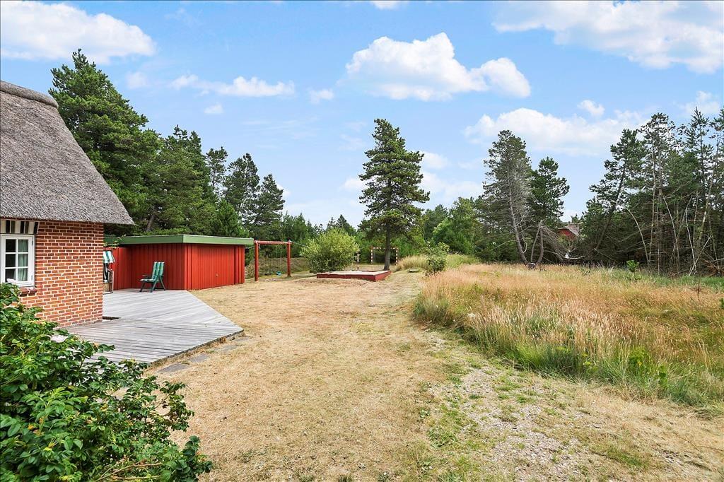 Ude i det fri er der mindst lige så godt at være, for her kan I nemlig nyde livet på en stor og solrig træterrasse, der smyger sig om to af sommerhusets sider. Naturgrunden måler hele 2.500 m², så der er god afstand til naboejendommene, og krogede fyrretræer sørger for at skærme godt af. Er der børn med på ferie, vil de garanteret blive glade for de gode legefaciliteter, som består af gynger, sandkasse og fodboldmål på græsplænen.