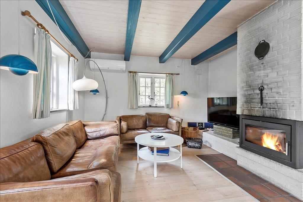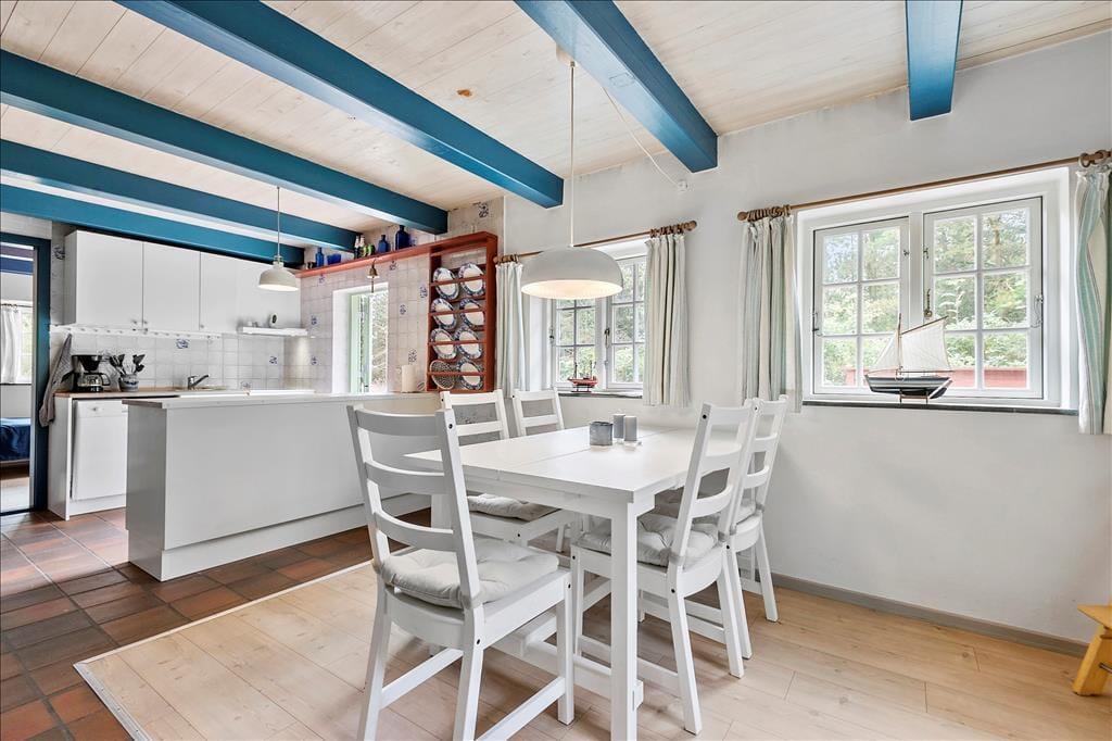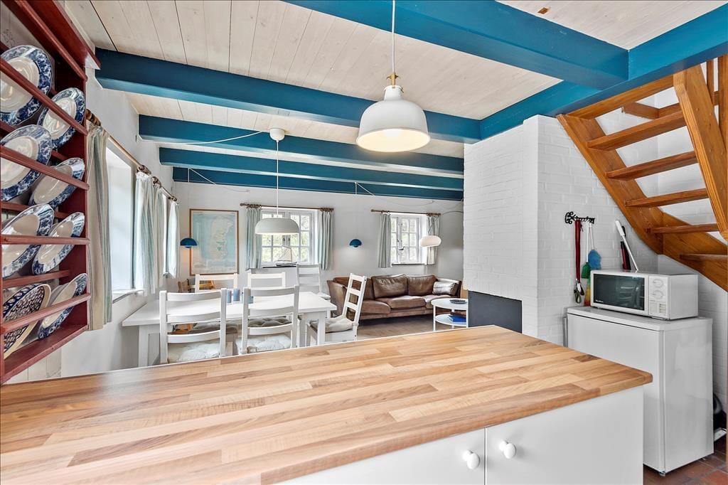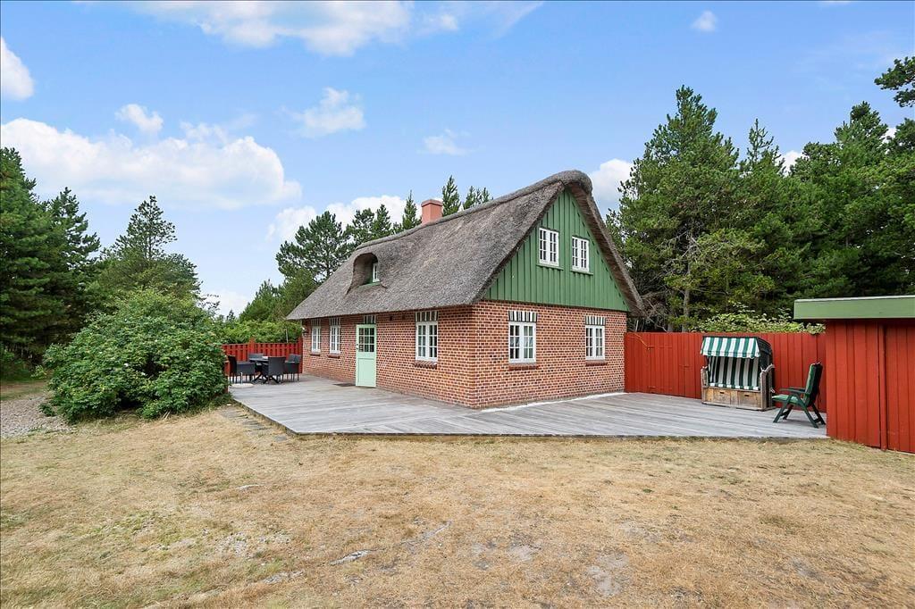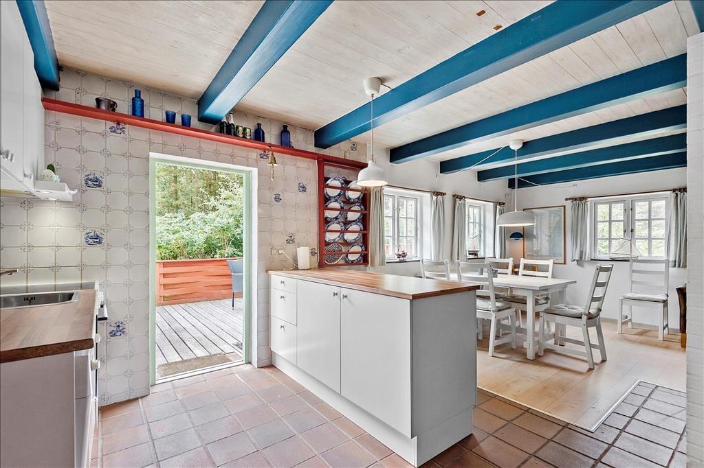 Sommerhuset passer smukt ind i Vadehavsøens viltre landskab med stråtag, rød murstensfacade og fine detaljer over sprossevinduerne. Inden døre kan man også mærke inspirationen fra de klassiske Rømø-huse, for her er der hollandske kakler ved køkkenet, og bjælkekonstruktioner og døre er malet i traditionelle almuefarver. Alt bidrager til at give jer en stemningsfuld ramme om feriedagene, der blandt andet kan udspille sig i opholdsrummet, hvor køkken og stue ligger i åben forbindelse. Her er der indbygningspejs og tv placeret ved sofaafdelingen, og på førstesalen finder I et ekstra opholdsrum. Huset byder endelig også på tre soveværelser og et badeværelse med bruser og gulvvarme.