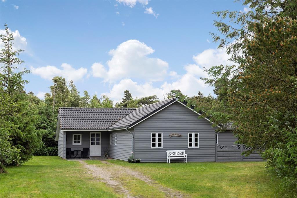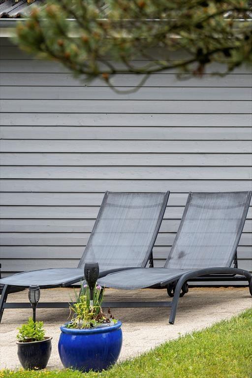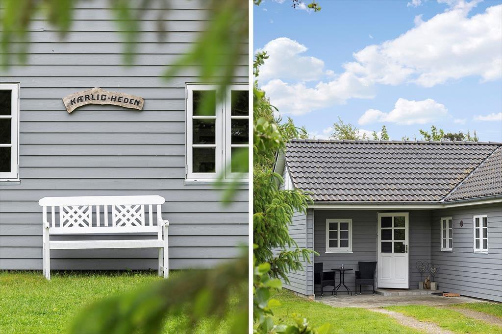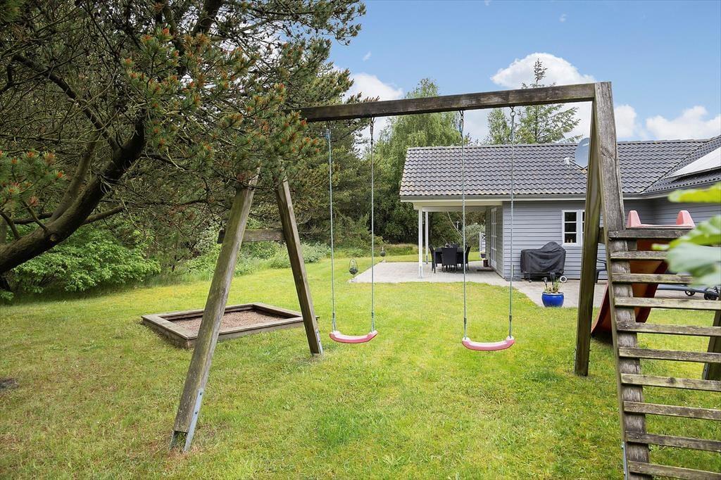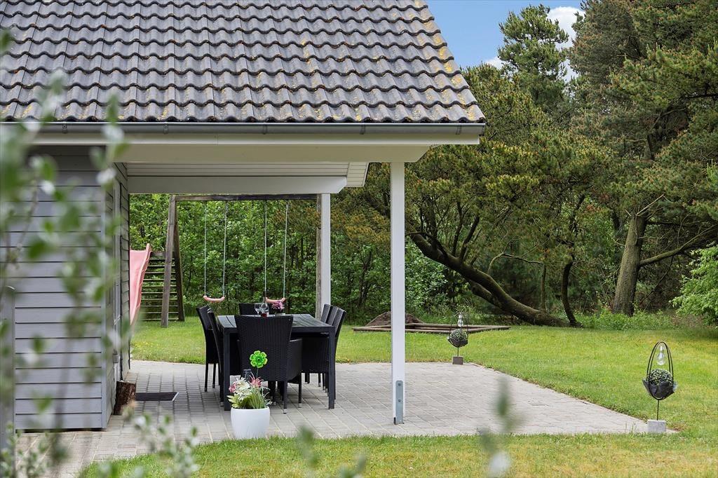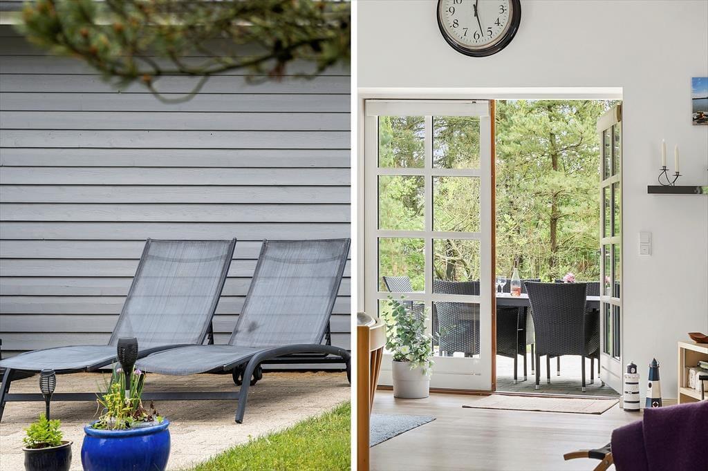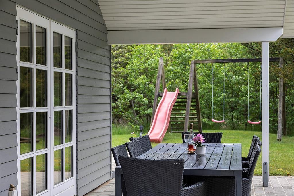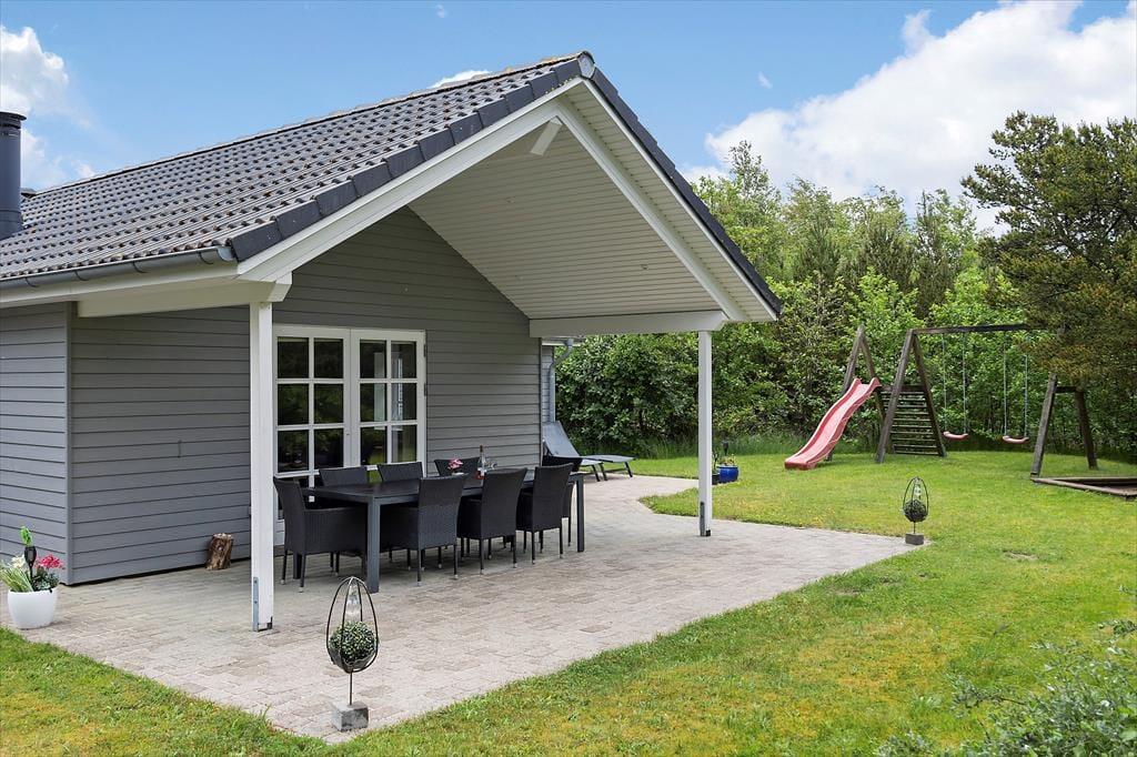 Afslapningsstunderne kan oplagt foregå ude i det fri, når sommersolen skinner højt på den blå himmel. Fra stuen kan I træde direkte ud på en delvist overdækket terrasse, og der er også flere åbne terrasseområder, så I får nemt ved at finde en passende opholdsplads. På grunden er der sandkasse og legestativ til børnene, og en carport giver plads til bilen foran huset.