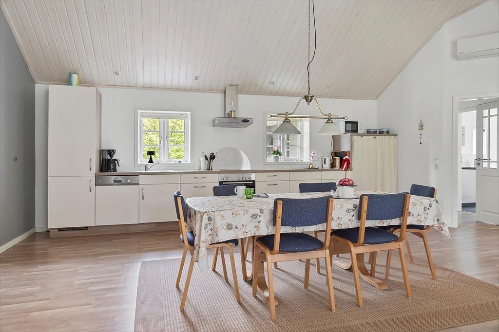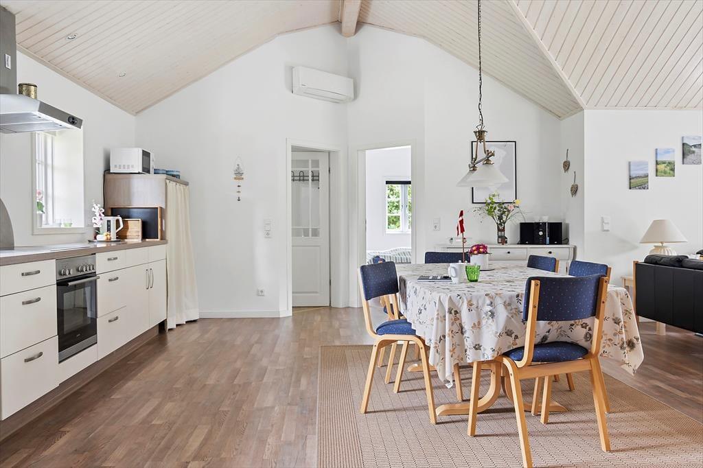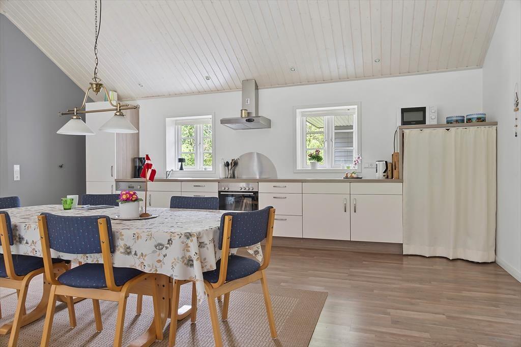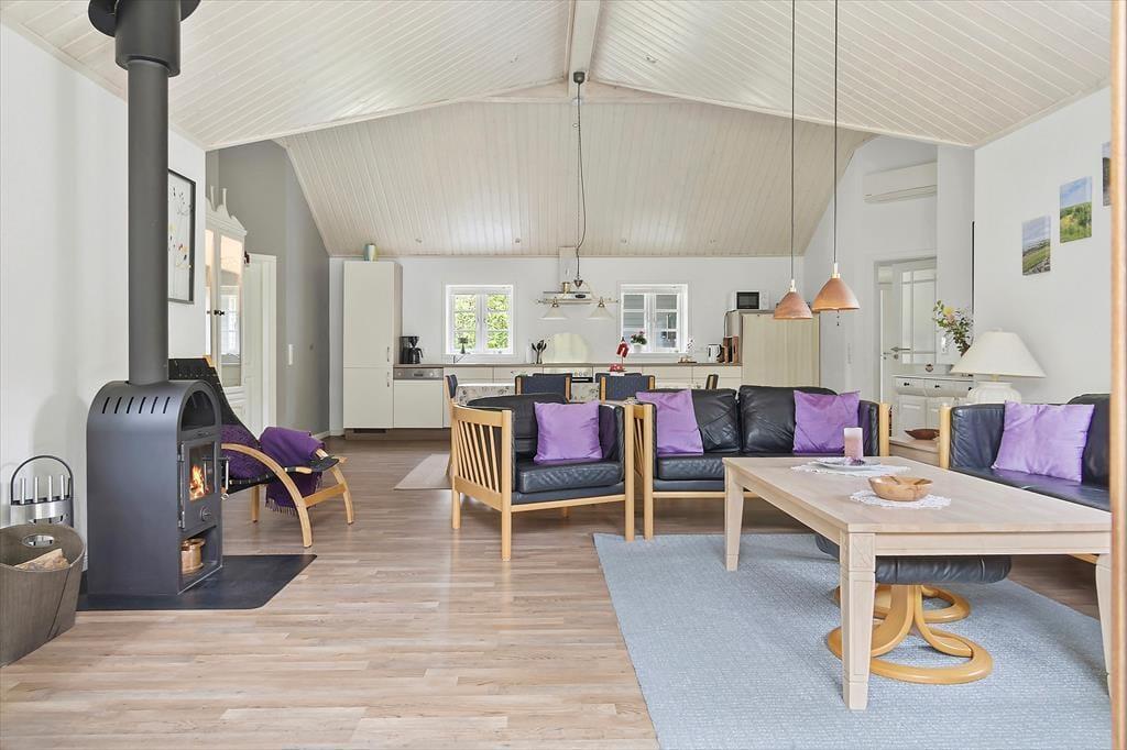 Inden døre i det velrenoverede sommerhus kan I brede jer på hele 119 m². Alle rum er lyse og store, inklusiv de tre gode soveværelser, der i alt kan huse otte personer. Badeværelset er lækkert indrettet med både bruseniche og spabad, mens køkkenet på praktisk vis er integreret med husets flotte og højloftede stue. Her er der brændeovn til de kølige hyggeaftener, og de komfortable siddemøbler lægger op til afslapning dagen lang – er det ikke det, man fortjener, når det endelig er ferietid? Har I brug for underholdning, kan I tænde for TV’et, der har parabol tilsluttet, så I kan vælge mellem danske, engelske og tyske kanaler.