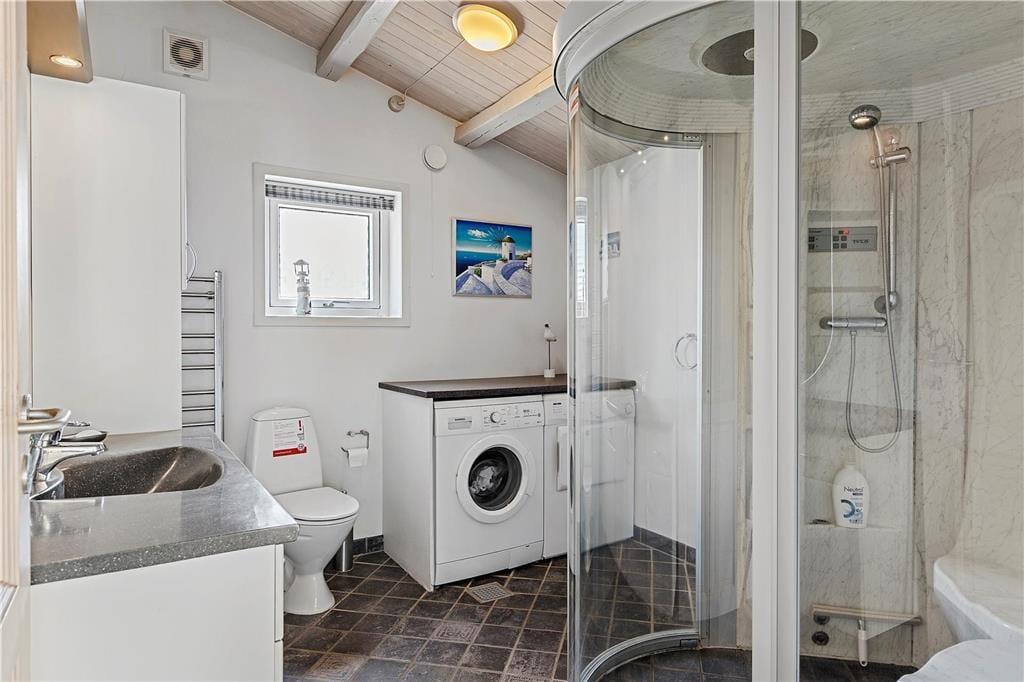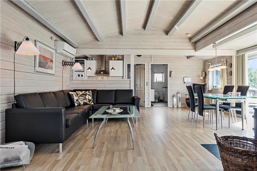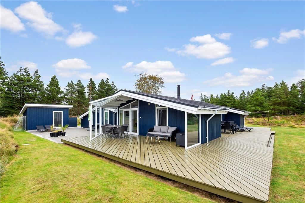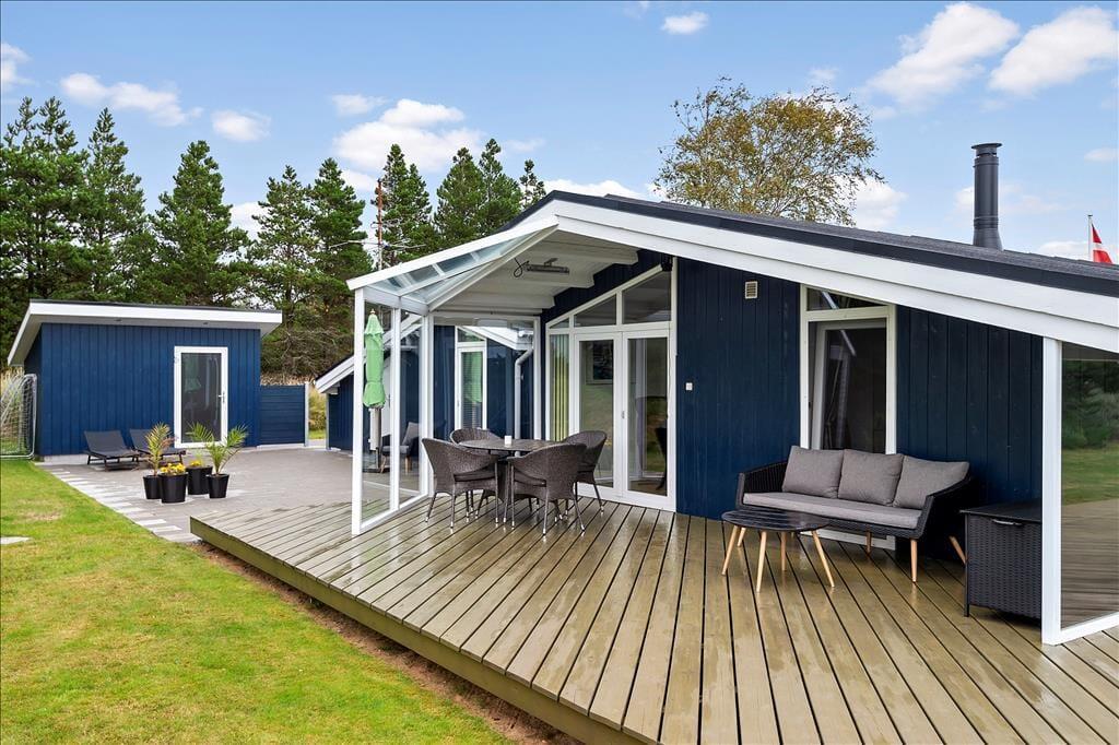 På flere sider af sommerhuset smyger en store træterrasse sig, hvilket gør det nemt at finde en passende opholdsplads uanset tidspunktet på dagen. En del af terrassen er endda overdækket og udstyret med glasafskærmning, så I kan finde både ly og læ her, hvis der skulle være brug for det. Trænger I til at komme op af liggestolene, er der god plads til at spille havespil på græsplænen.