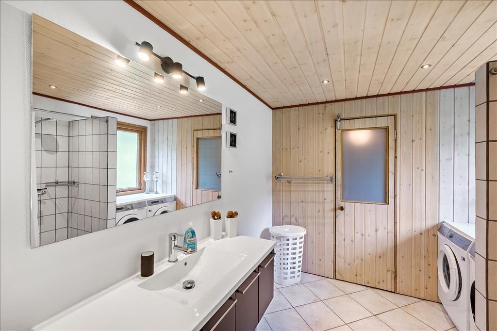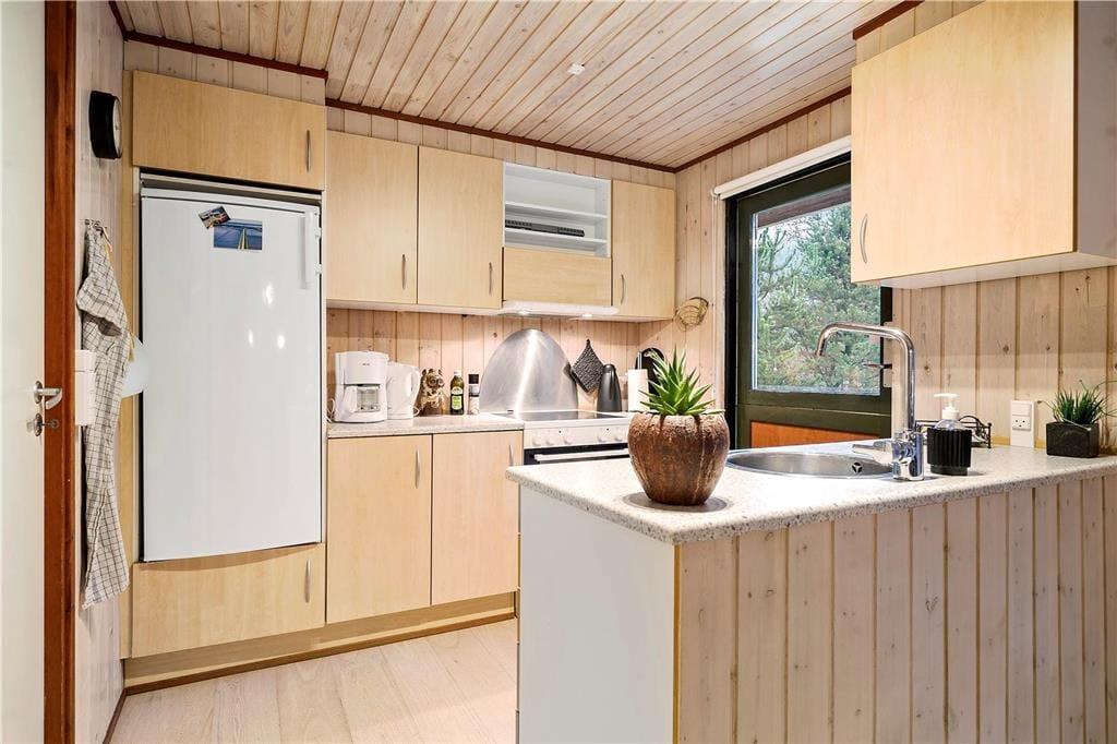 Der er virkelig lagt op til indendørs kvalitetstid i sommerhuset, der er et pænt og velholdt træsommerhus med rødmalet facade. Alle rum fremstår lyse og indbydende – selv bryggerset og badeværelset, hvoraf sidstnævnte er udstyret med vaskemaskine, tørretumbler og endda en sauna. Soveværelser er der to af, og dertil kommer et ekstra soverum i annekset, hvilket i alt giver plads til seks personer. De sociale hyggestunder kan udspille sig i sommerhusets flotte opholdsrum, der består af stue og køkken i åben forbindelse. I stuen er der brændeovn, flere gode siddemøbler og TV med danske og internationale kanaler – og hvis familien har modstridende ønsker, når I zapper gennem udvalget af programmer, er der for øvrigt også TV i annekset.