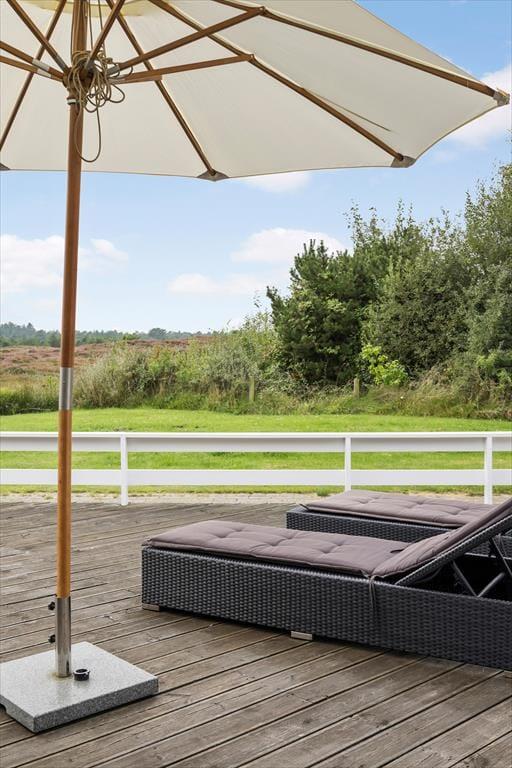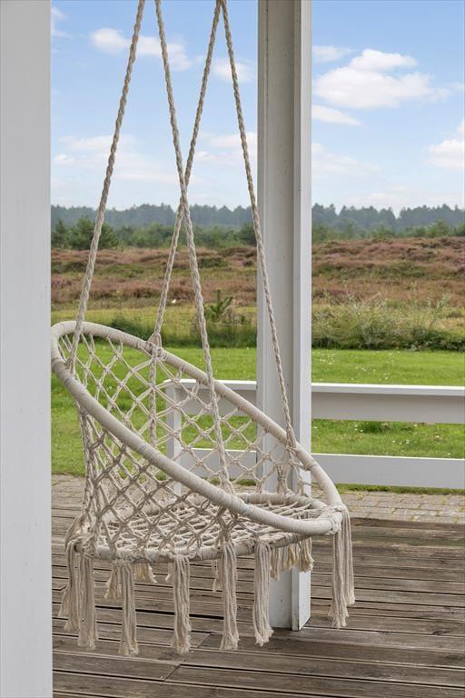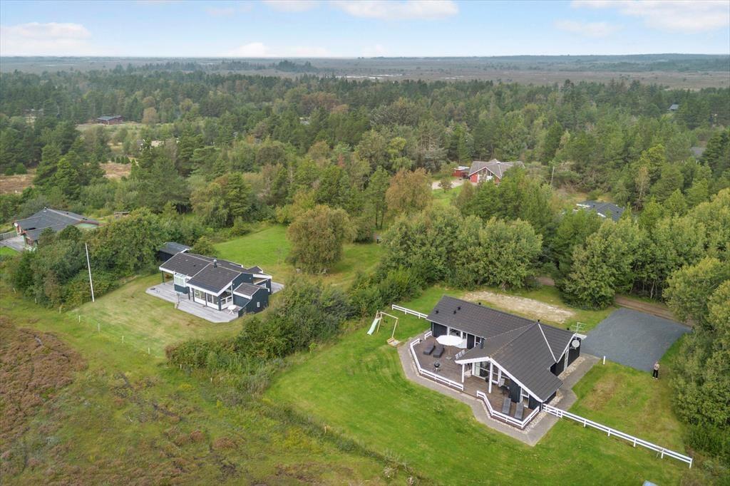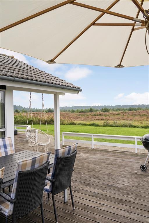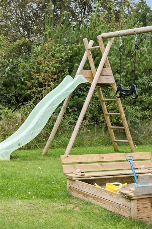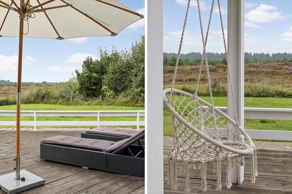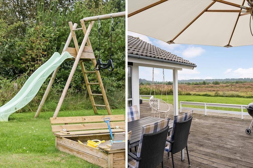 Udsigten er bestemt også imponerende ude på den store, delvist overdækkede træterrasse, der breder sig syd for sommerhuset. Det er et skønt sted at læne sig tilbage i havemøblerne, grille, mærke roen og nyde de uforstyrrede naturomgivelser. Trænger I til at bevæge jer lidt, er der god plads til kroket og andre havespil på græsplænen, og der er for øvrigt gyngestativ og sandkasse til de yngste familiemedlemmer.