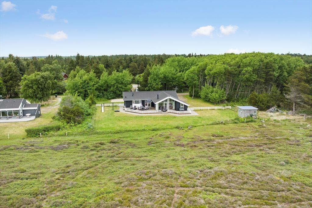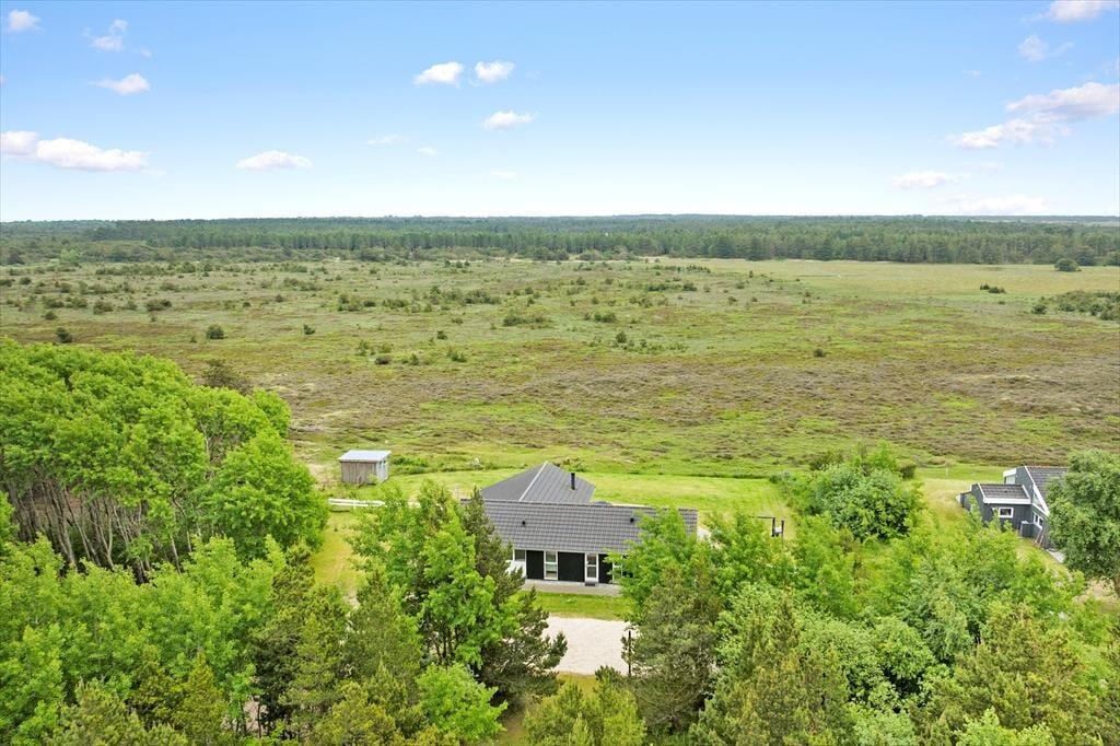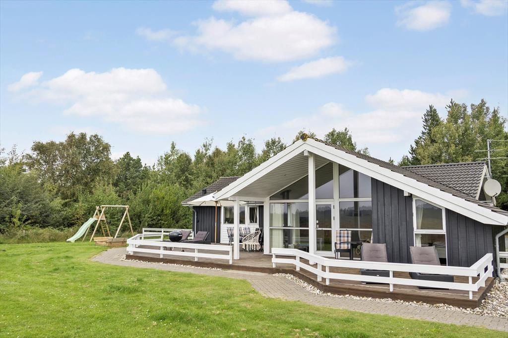 Sommerhuset er opført i 2006 og er et velproportioneret byggeri på hele 140 m2, som blandt andet er udstyret med spabad og sauna på det ene af to badeværelser. Inden døre er atmosfæren lys, luftig og indbydende, for i alle rum er der lyse trælister på væggene samt loft til kip, og de mange vinduespartier sørger for et glimrende lysindfald. Samtidig giver de store vinduer udsigt til de grønne omgivelser, og ikke mindst fra stuen og køkkenet er panoramavuet over det vidtstrakte landskab helt betagende. Hvis I ellers kan løsrive blikket fra naturomgivelserne, er der fladskærms-TV med både parabol, Smart-TV og Netflix i stuen, der også byder på en hyggespredende brændeovn til de kølige aftner. Fra stuen er der åben forbindelse til køkken-alrummet, så selv når I hygger jer hver især med madlavning, boglæsning og lignende, har I fornemmelsen af at tilbringe tiden sammen. Når dagen er ved at være til ende, kan I gå til ro på et af de fire gode soveværelser, der i alt kan huse otte feriegæster.