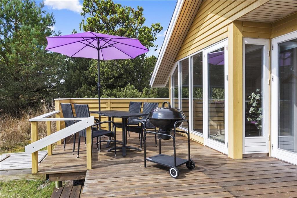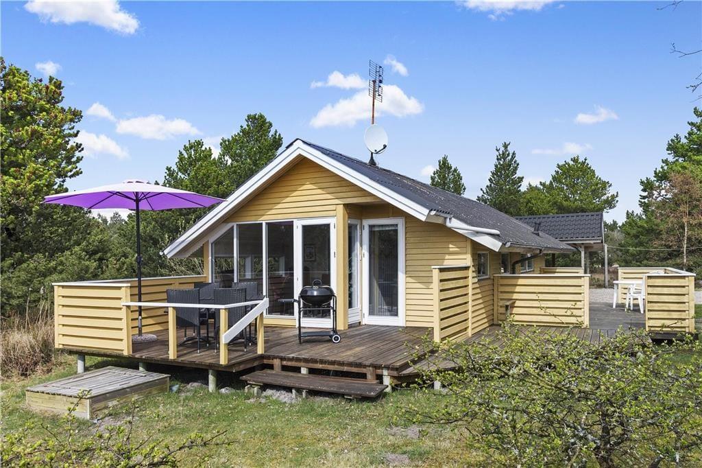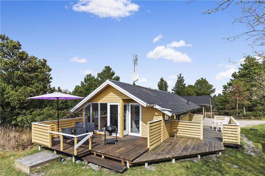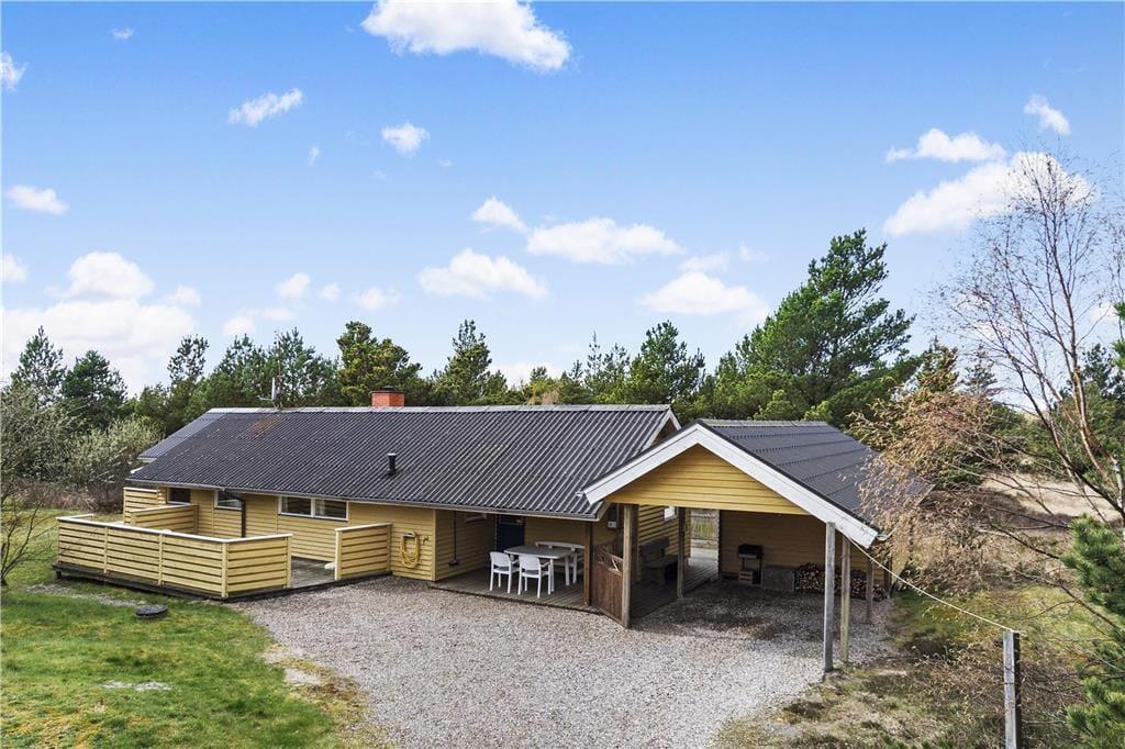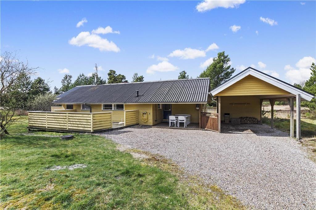 Fordi sommerhuset ligger på en lille stikvej, er omgivelserne rolige, og trafikken er absolut begrænset. Som et ekstra plus er flot natur lige i nærheden, for fra den 2700 m2 store grund kan I kigge lige ud på et åbent område. Udsigten kan I blandt andet nyde fra en af sommerhusets dejlige træterrasser, der med sin sydvestvendte placering ligger godt i forhold til solen. En carport står også på grunden, og til at forsøde ferielivet er der grill og komfortable havemøbler til rådighed – samt gynger og sandkasse til børnene.