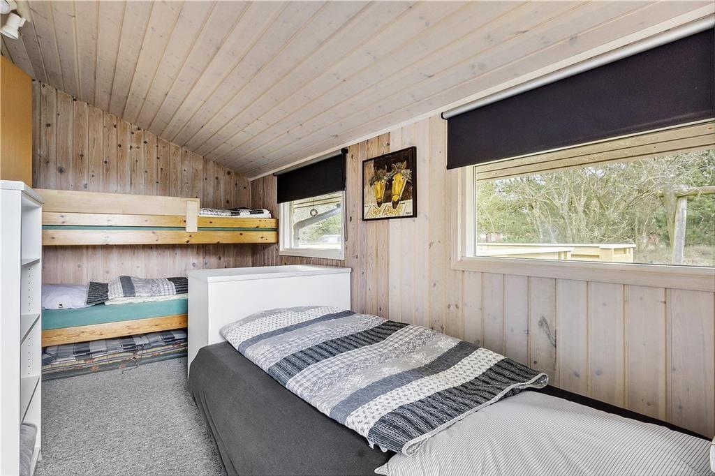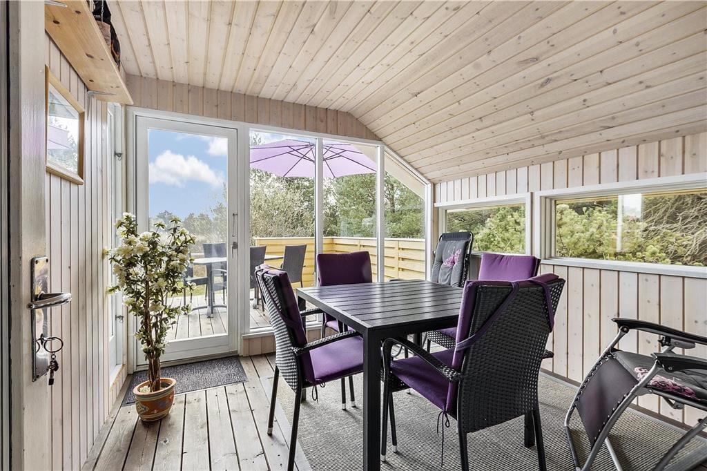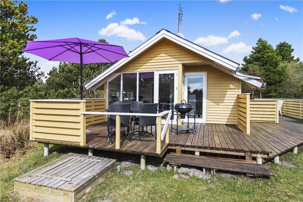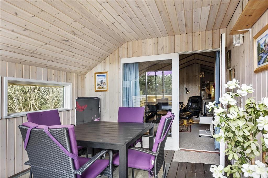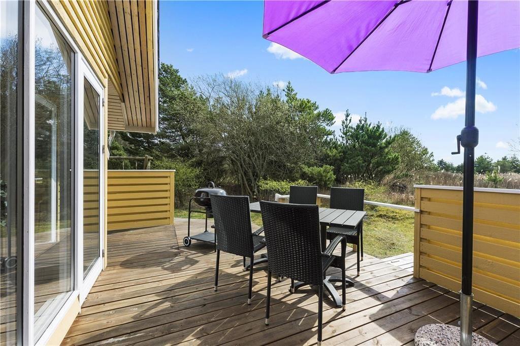 Fordi sommerhuset ligger på en lille stikvej, er omgivelserne rolige, og trafikken er absolut begrænset. Som et ekstra plus er flot natur lige i nærheden, for fra den 2700 m2 store grund kan I kigge lige ud på et åbent område. Udsigten kan I blandt andet nyde fra en af sommerhusets dejlige træterrasser, der med sin sydvestvendte placering ligger godt i forhold til solen. En carport står også på grunden, og til at forsøde ferielivet er der grill og komfortable havemøbler til rådighed – samt gynger og sandkasse til børnene.