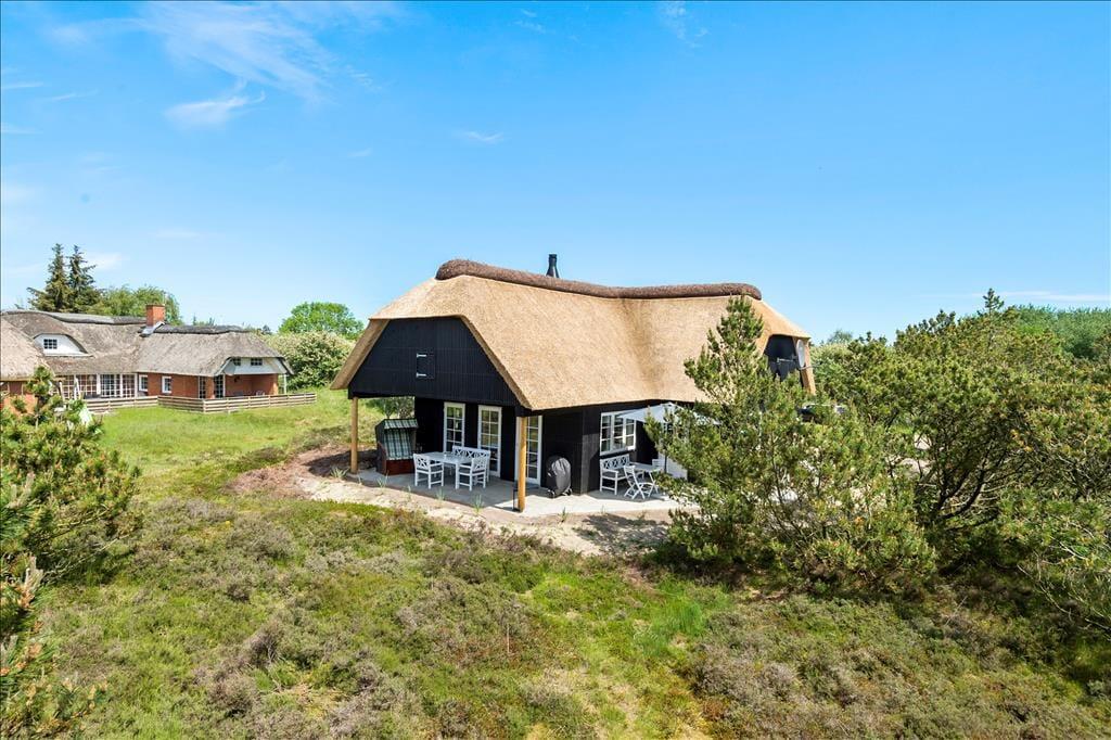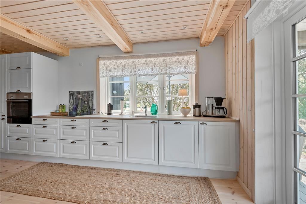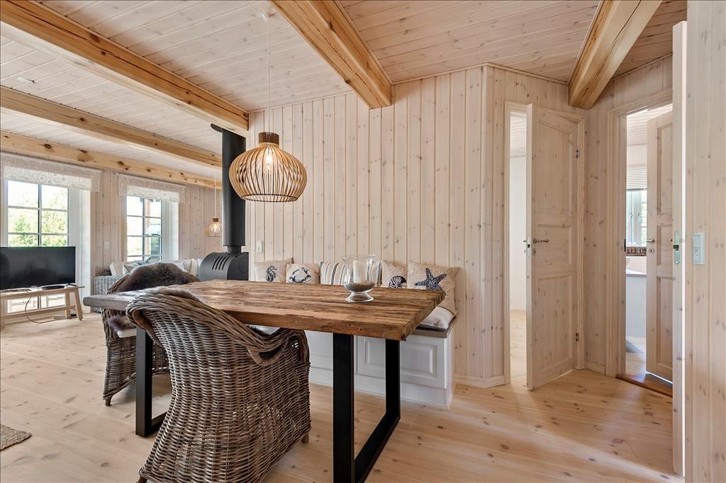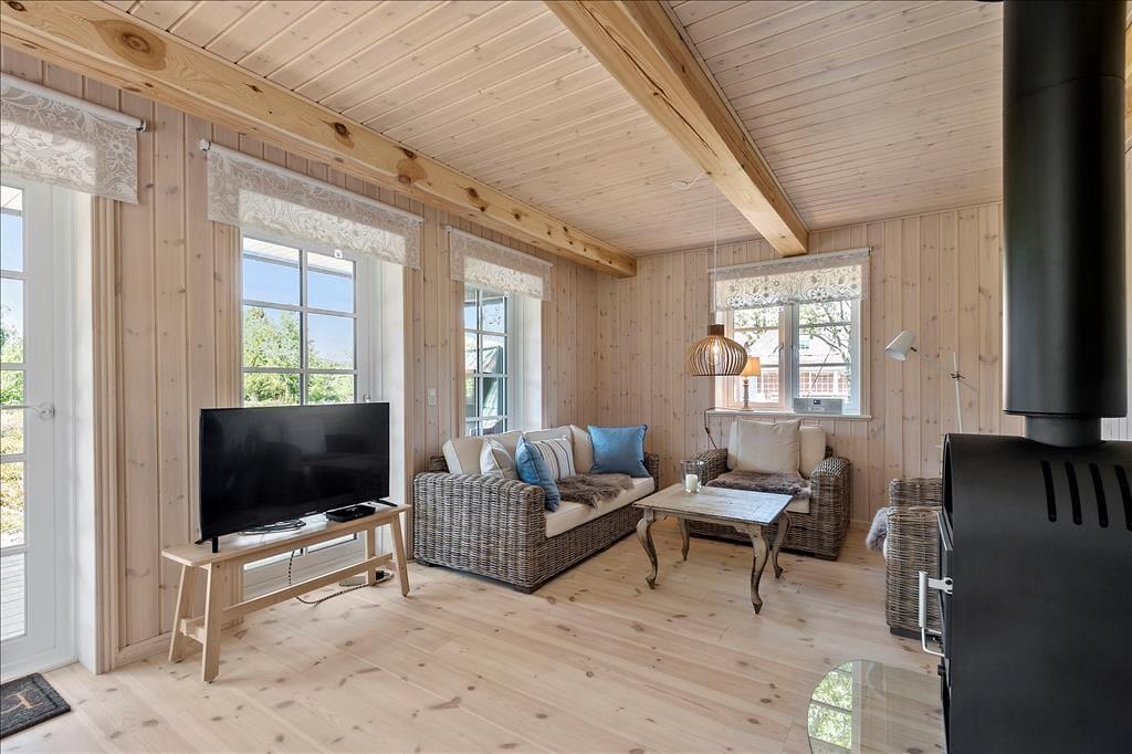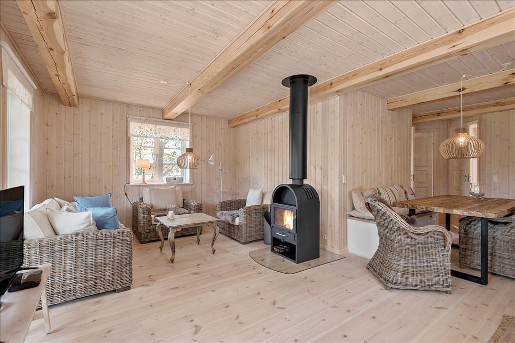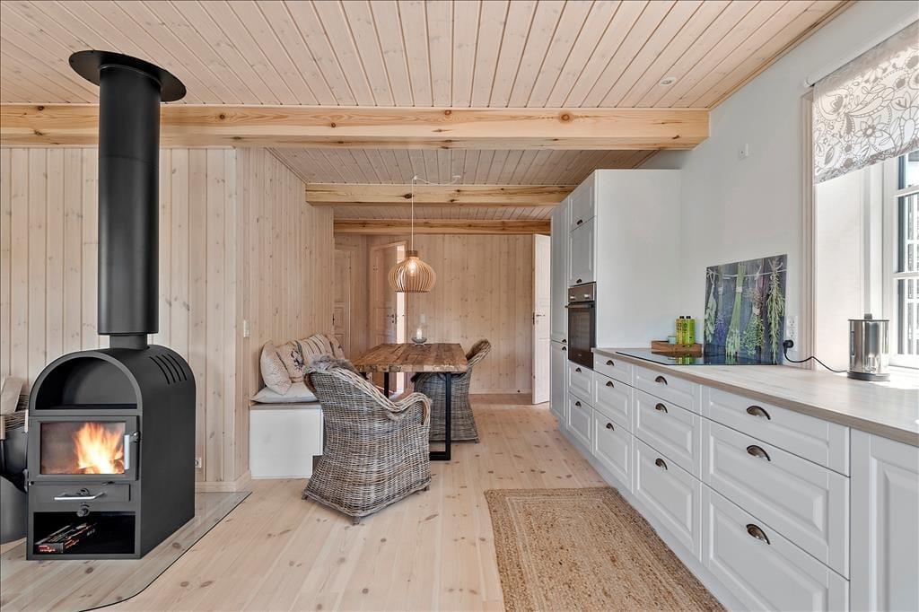 Da sommerhuset blev opført i 2021, blev det opført i klassisk stil med stråtag, hvide sprossevinduer og sortmalet træfacade. Også inden døre er det lykkedes at skabe en varm og venlig atmosfære – præcis som der skal være i et rigtigt sommerhus. I stuen er der trælister på vægge og lofter, og et flot åbent køkken passer godt ind i de lyse og hyggelige omgivelser. En brændeovn står klar til at sprede god stemning, og der er også varmepumpe til eventuelle kølige aftener. På de tre soveværelser fortsætter den gode indretningsstil, og også badeværelset og entréen fremstår lyse og indbydende.