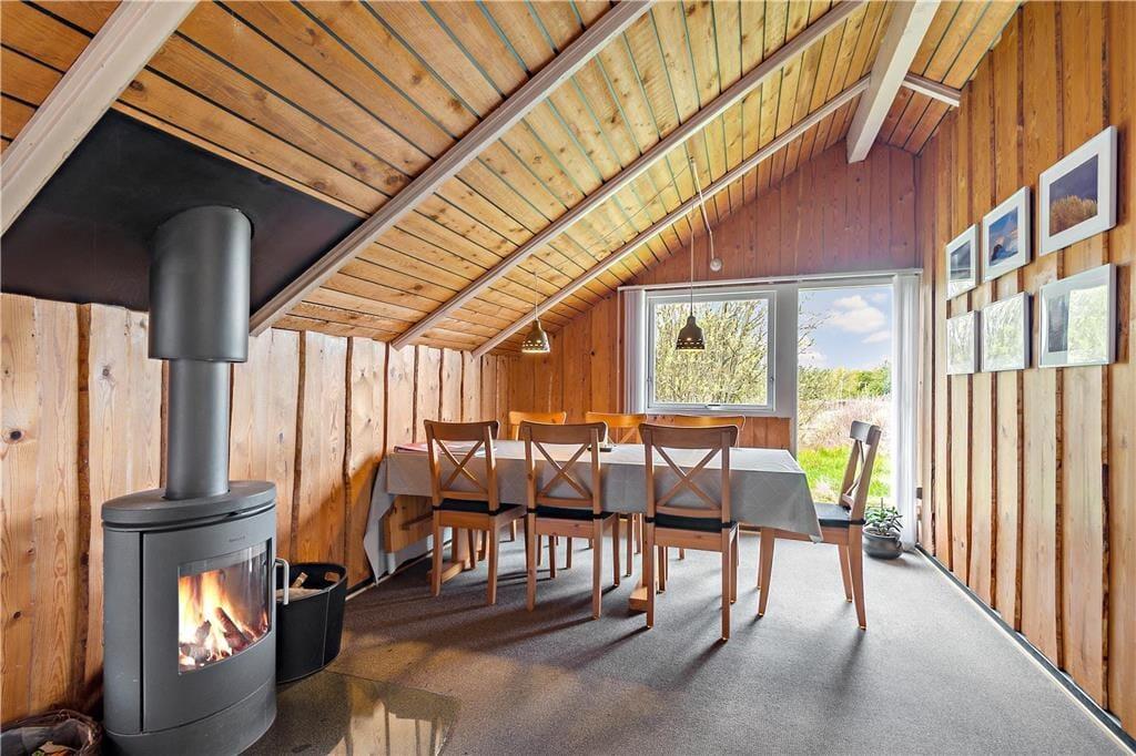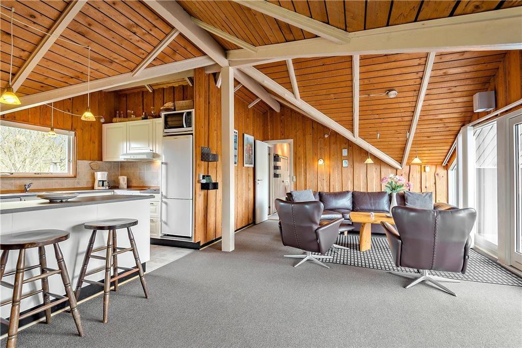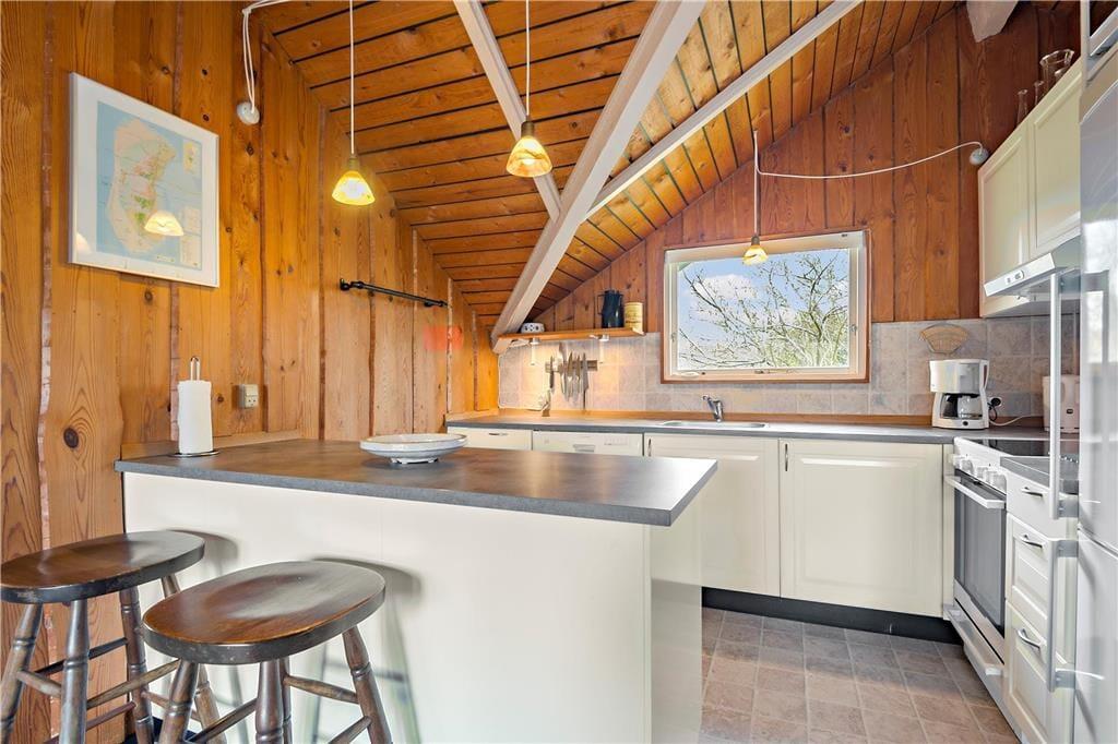 Balancen mellem klassisk sommerhuscharme og luksuriøs komfort er virkelig velfungerende i sommerhuset, der er opført i 1986 og renoveret i 2009. Skråvæggene med rustikke trælister giver masser af personlighed til huset, som samtidig er fuld af lækre elementer – inklusiv et flot åbent køkken og et badeværelse med spabad. Vil I kombinere det afslappende spabad med en tur i saunaen, kan det sagtens lade sig gøre, for der er sauna i annekset ved siden af sommerhuset. Det førnævnte køkken er integreret med stuen, og alt i alt er det et særdeles hyggeligt opholdsrum, endda med brændeovn og et dejligt lysindfald fra tre verdenshjørner. Soveværelser er der tre af, og de er alle indrettet med dobbeltseng.