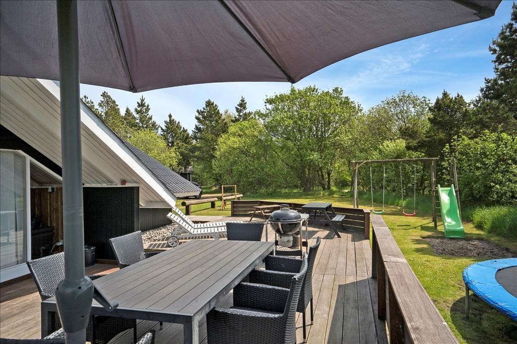En stor del af ferien bliver formentlig tilbragt ude i det fri, når vejrguderne er i det lune hjørne. I hvert fald råder I over en kæmpestor og solrig træterrasse, og der er masser af plads til at lege, spille bold og slænge sig på den dejlige grund, som også byder på gyngestativ, sandkasse og trampolin til de yngste familiemedlemmer. En del af terrassen er overdækket, så på en skøn sommeraften kan I sagtens blive siddende ude, selvom duggen falder.
