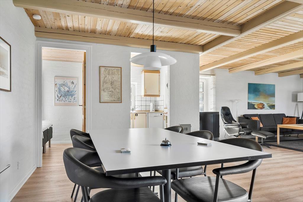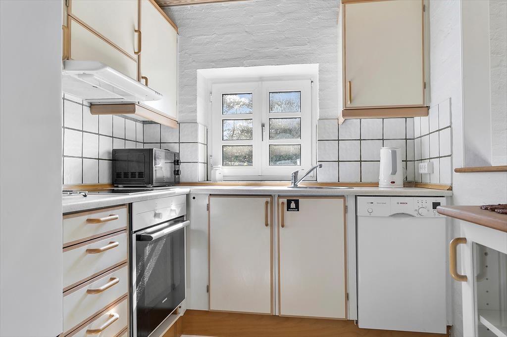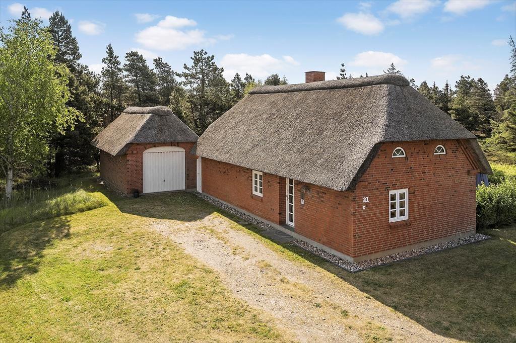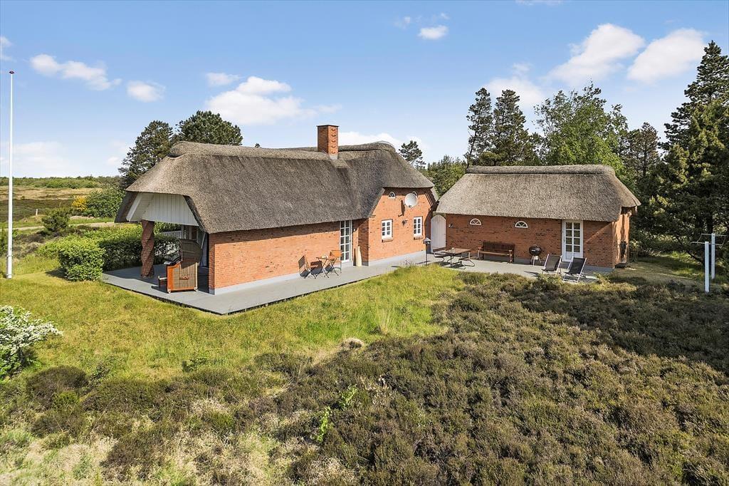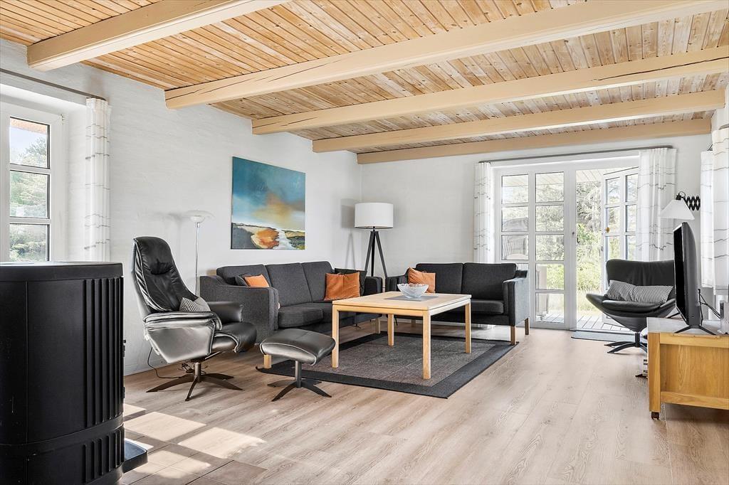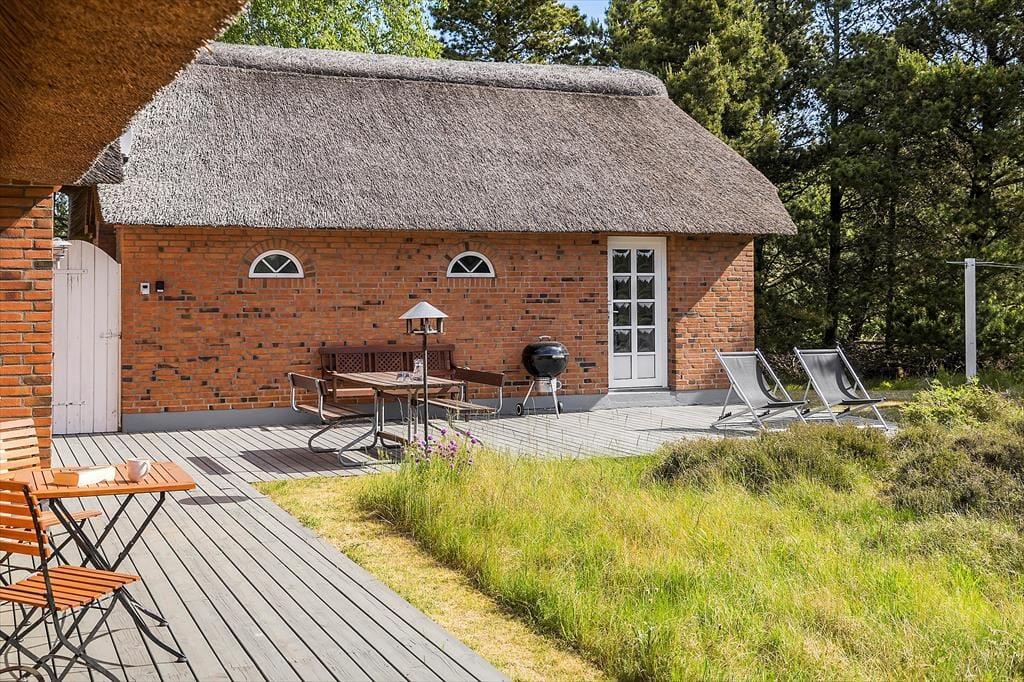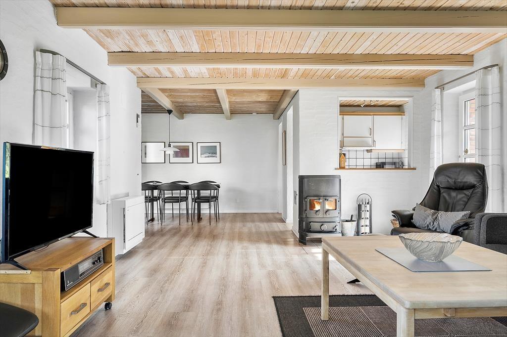 På adressen er det bestemt ikke kun udsigten, der lokker, for selve sommerhuset er et særdeles charmerende eksemplar med stråtag, hvide sprossevinduer og rød murstensfacade. Inden døre kan I brede jer på 90 m2, der blandt andet byder på tre soveværelser, et køkken og et badeværelse. Sidstnævnte har den skønne detalje, at der er sauna – så hvis Vesterhavet var koldere end forventet, kan I blive varmet igennem efter badeturen. I husets store vinkelstue kan I også nemt få varmen, for her er der både brændeovn og varmepumpe.