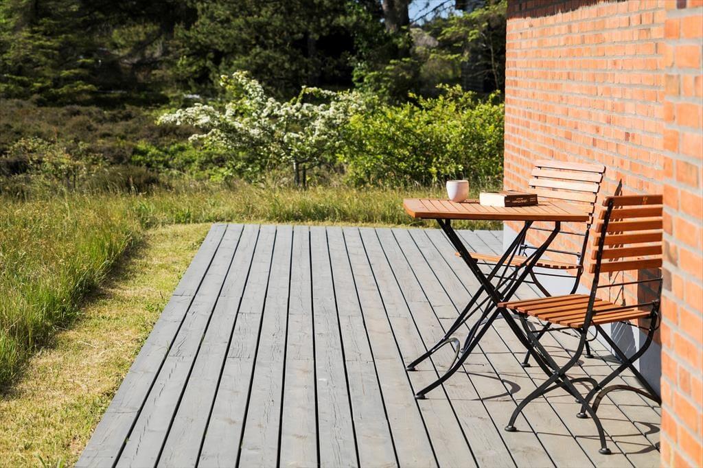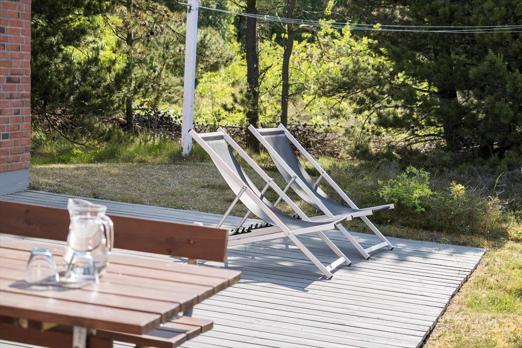 Rundt om flere af husets sider smyger en stor træterrasse sig. Det gør det nemt at finde en passende opholdsplads i solen, og hvis I hellere vil have skygge, kan I slå jer ned på det overdækkede terrasseareal. Den sydvestvendte terrasse er det oplagte valg, når I vil virkelig vil nyde udsigten over det åbne land. Det er nu også ganske glimrende at sidde på østterrassen i læ mellem garagen og huset, for her kan I kigge lige ud på jeres egen store naturgrund.