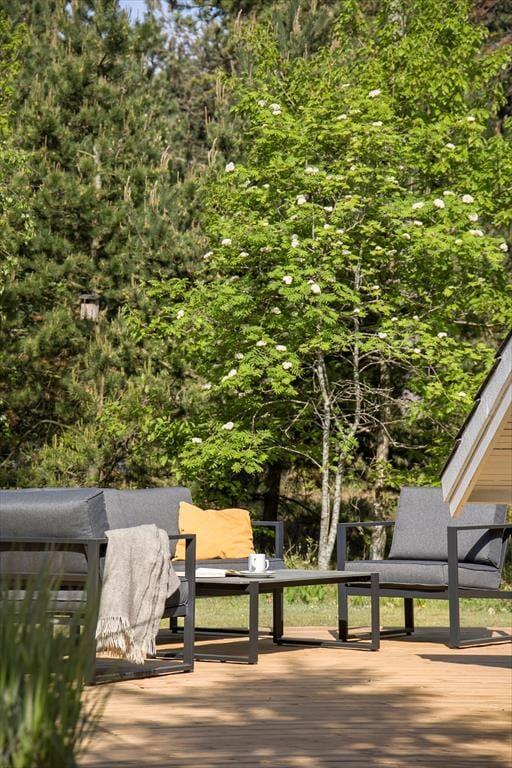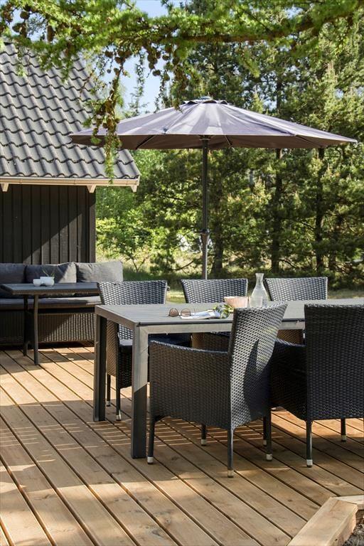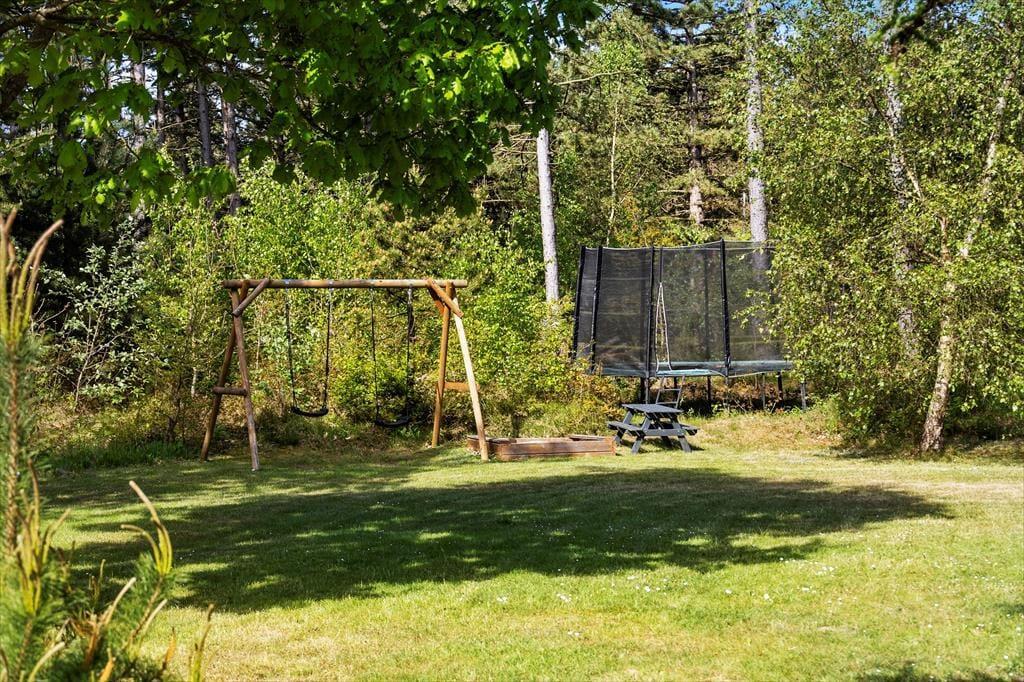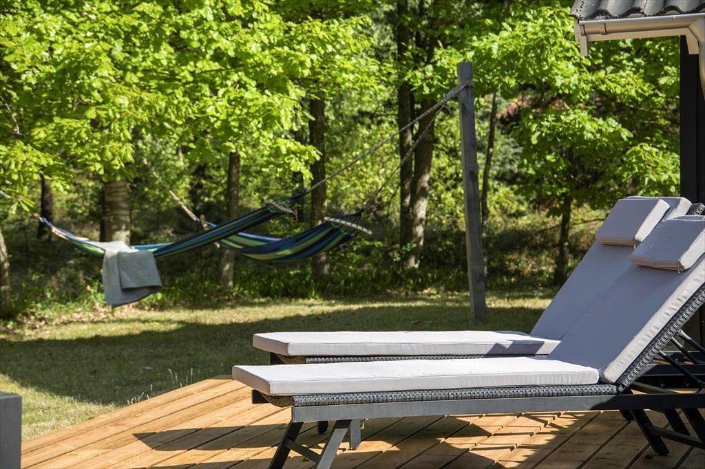 Fra opholdsafdelingen har du direkte adgang til en 115 m2 stor og solrig træterrasse, så hvis du vil have avisen og en kop kaffe med ud i det fri, er det nemt at komme ud. Det er fristende at blive i timevis i liggestolene, og man kan jo flytte efter solen hele dagen. Men der er nu også meget andet skønt at tage sig til på naturgrunden, der er en stor og skøn oase med en velholdt græsplæne og mere viltre områder. Børnene kan hygge sig med at gynge og bygge slotte i sandkassen, og shelteret er også et hyggeligt sted at lege for de mindste – hvis ikke I ligefrem bliver fristet til at sove herude på de stille aftner, hvor I har hygget jer omkring bålet og nydt godnatsangene fra områdets vilde fugle. Shelteret er udstyret med myggenet.