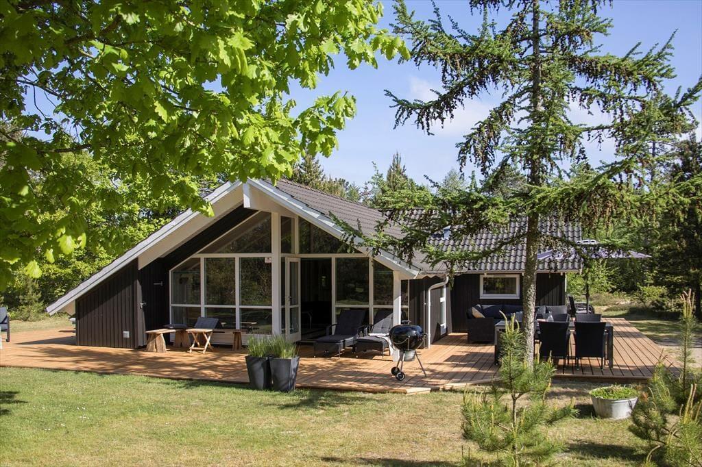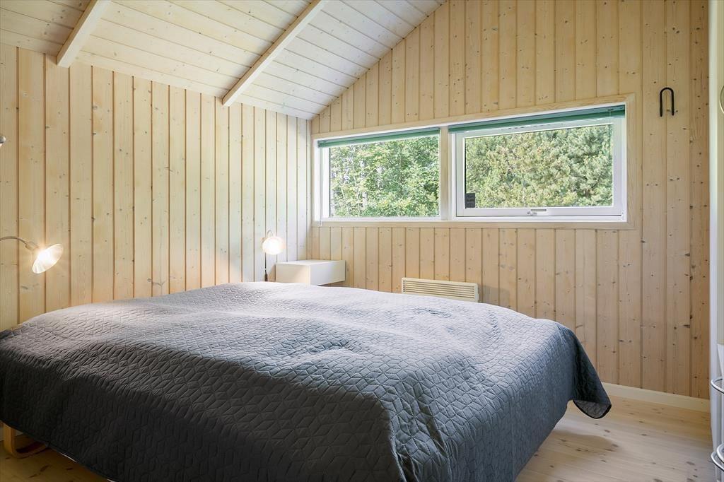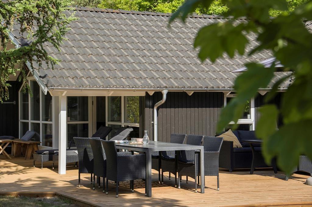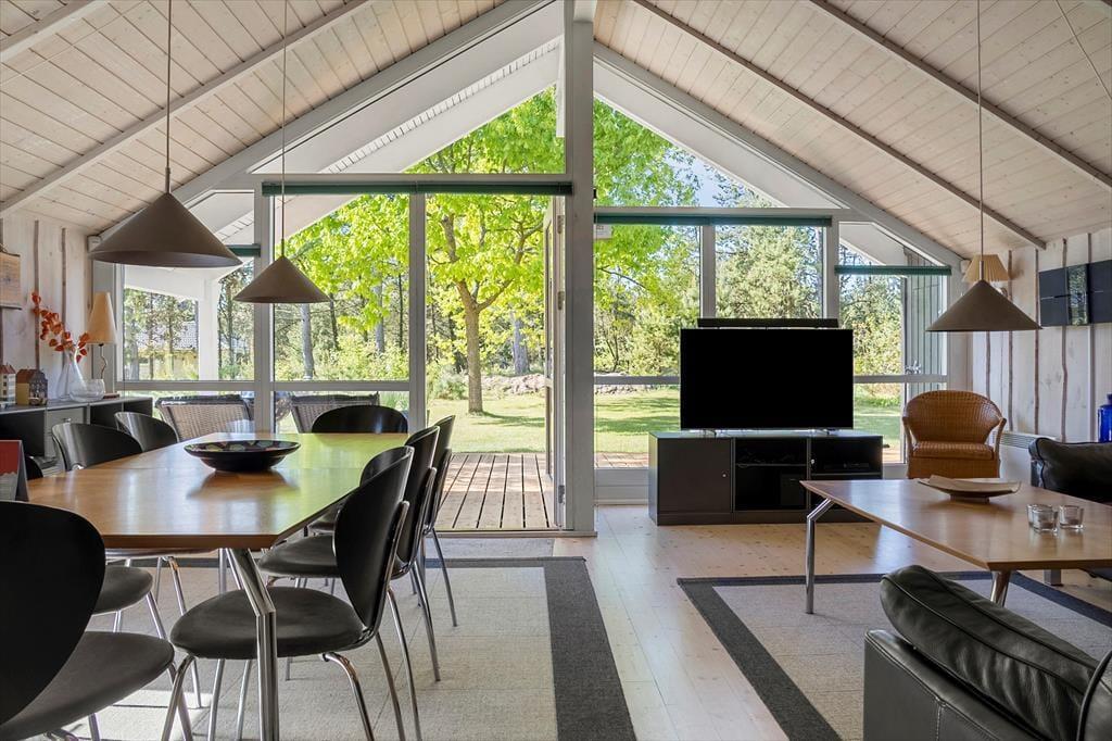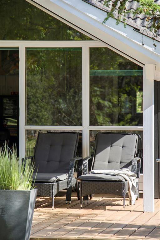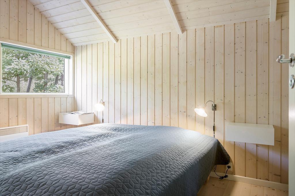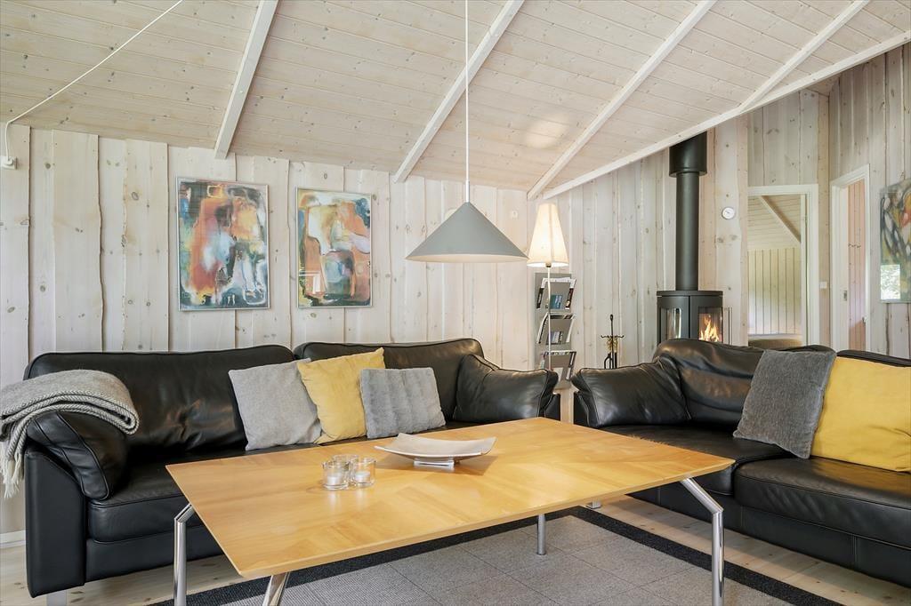 Sommerhuset har ligget her på den skønne adresse siden 2001, og ligger med en flot kontrast midt i alt det grønne med sin malede træfacade. Inden døre er der loft til kip og lys træbeklædning på væggene, og møblementet er nøje udvalgt, så det passer godt ind i rummene. Når du står og brygger kaffe i køkkenet, kan du takket være den åbne forbindelse til stuen sagtens følge med i børnenes leg eller hyggesnakke med din bedre halvdel. Brændeovnen er en af stuens hyggelige detaljer, og det er for øvrigt også herligt, at der er sauna på badeværelset, hvis du trænger til at slappe helt af efter dagens udendørs aktiviteter. Ved entréen finder du et gæstetoilet, og på de tre soveværelser er der alt i alt plads til syv feriegæster.