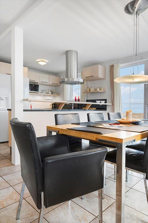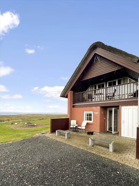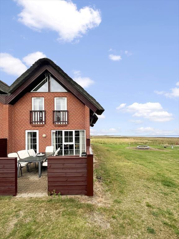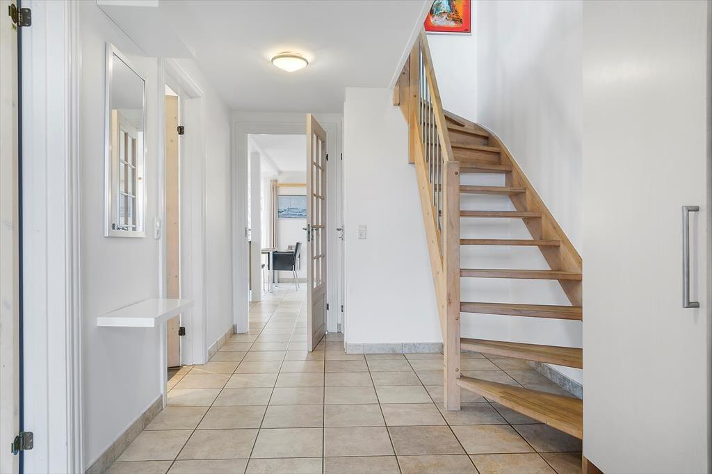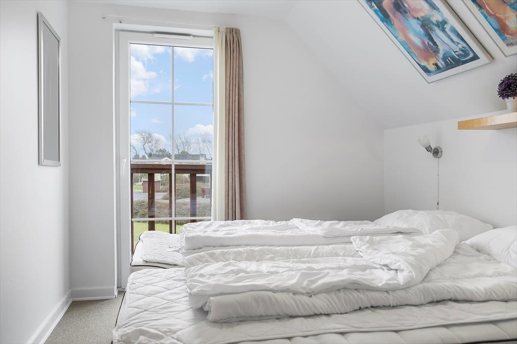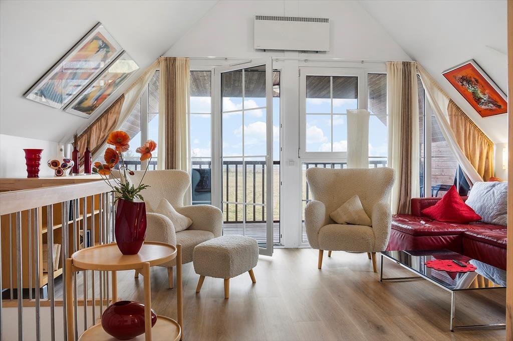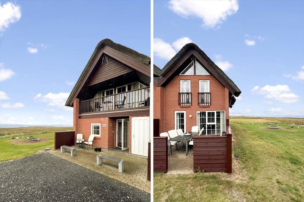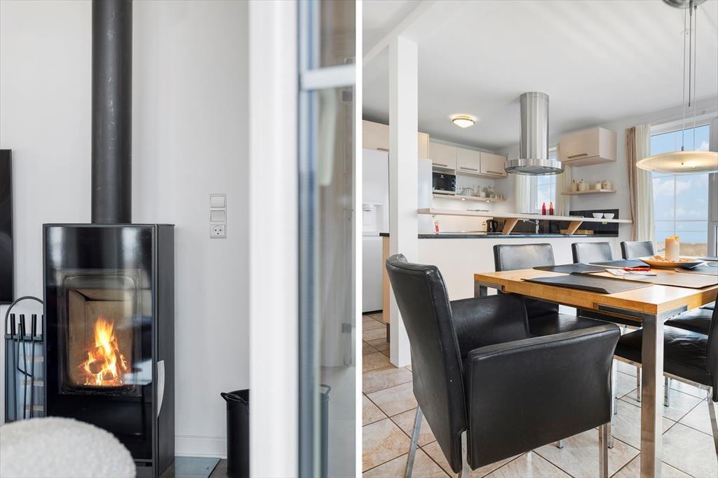 Med så eksklusiv en beliggenhed blev der selvfølgelig gjort meget ud af selve ferieboligen, da den blev opført i 2005. Selvom rækkehusene er en moderne bebyggelse, er stilen holdt i klassisk Rømø-stil med rød murstensfacade og stråtag. Inden døre kan I brede jer på 116 m2 i halvandet plan, der blandt andet byder på tre soveværelser og to komplette badeværelser, hvoraf det ene er udstyret med spabad. På praktisk vis er sovegemakkerne og badeværelserne placeret både i stueplan og på førstesalen, og som supplement er der to madrasser på hemsen, så i alt kan der være otte feriegæster inden døre. Alle kan samles i stueplanets køkken-alrum, hvor I kan nyde den flotte vadehavsudsigt – både når I sidder omkring spisebordet og når I kokkerer i køkkenafdelingen, som byder på amerikanerkøleskab, opvaskemaskine og andre lækre detaljer. Havudsigt og en hyggelig atmosfære er der for øvrigt også i førstesalens stue, hvor I kan slappe af i sofaen nær brændeovnen.