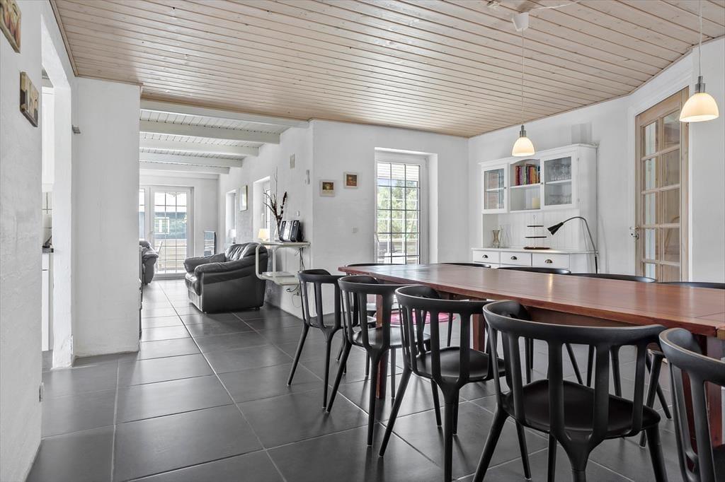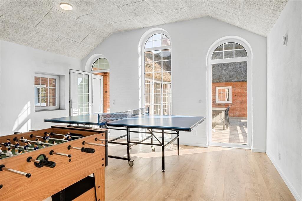 Det 217 m² store stråtækte sommerhus har en glimrende planløsning til 12 personer, så det kan oplagt danne rammen om nogle dejlige dage med storfamilien eller med en flok gode venner. Fire soveværelser er ligeligt fordelt mellem stueetagen og førstesalen, og dertil kommer en stor hems med ekstra sovepladser. Opholdsarealerne har en smart opdeling, for mens køkken og stue er integreret på velfungerende vis, ligger aktivitetsrummet og wellnessafdelingen i en separat fløj, som du har adgang til via en glasklædt svalegang. Med andre ord kan du nemt hygge dig i ro og mag under madlavningen, selvom der er gang i bordtennisspillet og bordfodbold-dysten. Wellnessafdelingen byder på en hjørnespa og en lille swimmingpool, og herfra har du adgang til et af husets badeværelser, der fremstår pæne og velholdte som de øvrige rum.