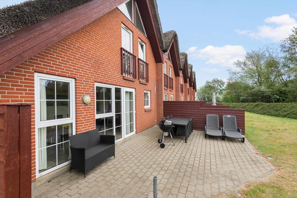 Til forskel fra de fleste andre boligenheder i bebyggelsen er dette et enderækkehus, hvilket betyder, at du kun har naboer til den ene side. Inde bag det høje stråtag og rødstensmurene kan du se frem til at nyde livet i lyse og velindrettede omgivelser, og med hele 116 m² fordelt på to plan er der godt med plads. Stueplan byder på en rummelig entré og et stort køkken-alrum, hvor du kan kræse om maden og samles til lækre måltider og langstrakte samtaler. Der er også et enkelt soveværelse og et badeværelse med bruser og hjørnespa, mens førstesalen rummer to ekstra soveværelser og endnu et badeværelse. En stue ligger også ovenpå, og her kan du rigtigt hygge dig – uanset om det er vejr til at tænde op i brændeovnen, eller om du lader døren til altanen stå på klem. Helt i toppen af ferieboligen finder du endelig en hems med ekstra madrasser.