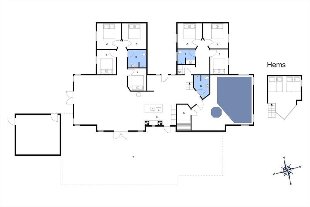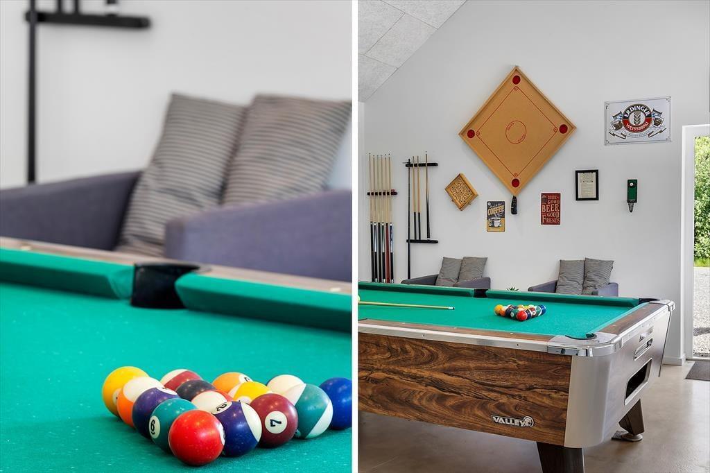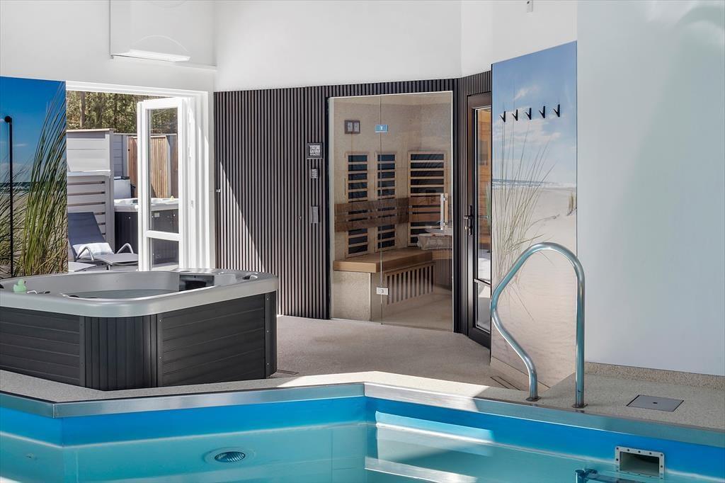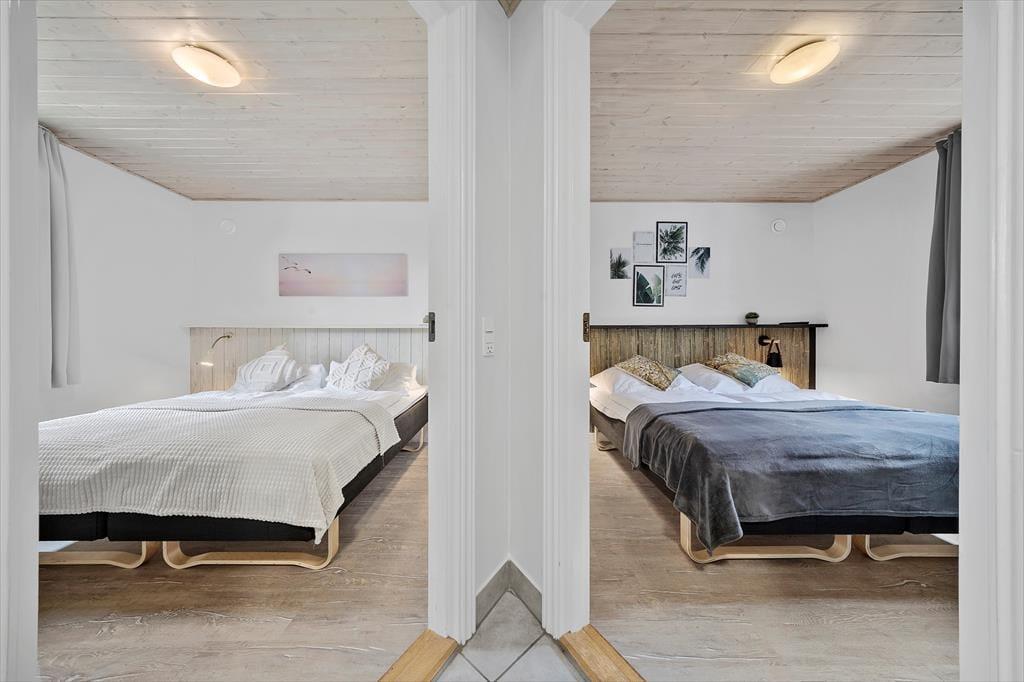 Sommerhuset ligger i Kongsmark midt på Rømø, og er løbede blevet renoveret, så det absolut er fulgt med tiden. I 2022 blev der foretaget omfangsrige forbedringer, hvor husets syv soveværelser har fået den helt store tur – det føles nærmest som at tjekke ind på et boutiquehotel, hvor værelserne har hver sin unikke stil. Et fællestræk for soveværelserne er de komfortable dobbeltsenge, som også kan adskilles til enkeltsenge, og så er det for øvrigt smart, at de er placeret i to separate afsnit med hver sit badeværelse. Er I mange samlet, kan I tage hemsen i brug, for her er der plads til yderligere fire personer. Husets tredje badeværelse ligger som del af den lækre poolafdeling, hvor I kan nyde livet i swimmingpoolen, spabadet og saunaen. Poolrummet er i marts 2025 blevet renoveret, så det også fremstår lyst og moderne. Et andet hyggeligt samlingspunkt er aktivitetsrummet, hvis I vil dyste i pool og bordfodbold – og ellers er det herligt at mødes i det store og højloftede opholdsrum, der er indrettet med et flot køkken, brændeovn, langbord og en rummelig sofaafdeling.